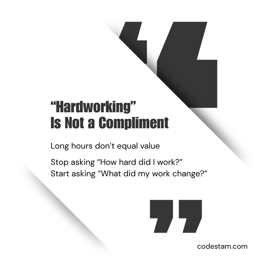 “Hardworking” Is Not a Compliment Long hours do not equal value. Common patterns: Excessive effort on low-impact tasks Perfection applied where speed was needed Visibility mistaken for contribution Output quality and decision accuracy matter m