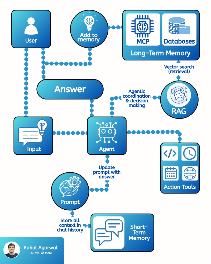 Hands down the simplest explanation of AI agents using LLMs, memory, and tools. A user sends an input → the system (agent) builds a prompt and may call tools and memory-search (RAG) → agent decides and builds an answer → the answer is returned to th