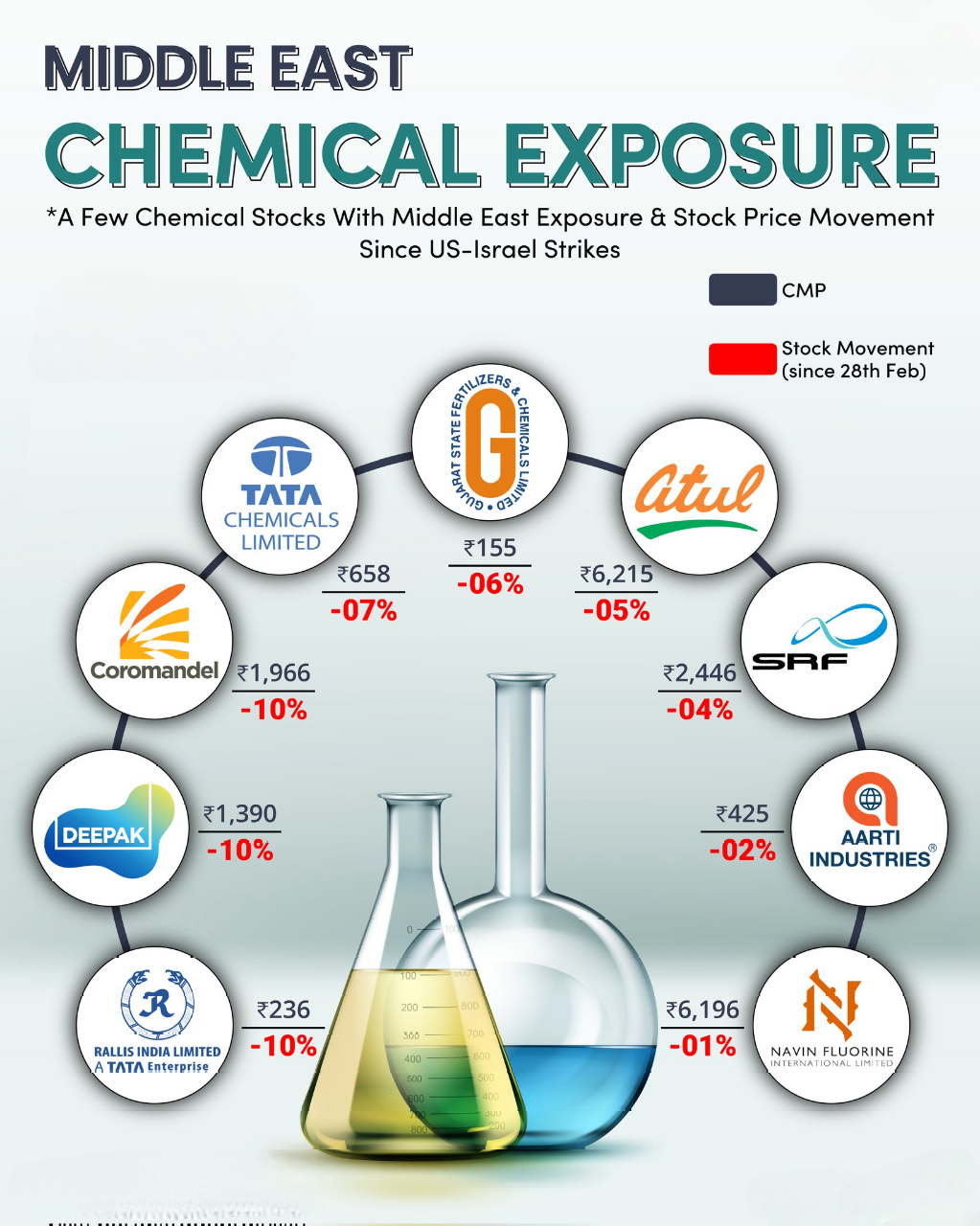 Middle East Tension Impact 🧪📉 Chemical stocks under pressure after US-Israel strikes: Tata Chemicals ↓7% GSFC ↓6% Atul ↓5% SRF ↓4% Aarti Ind ↓2% Navin Fluorine ↓1% Coromandel / Deepak / Rallis ↓10% ⚠️ Reason: Middle East exposure → supply risk →
