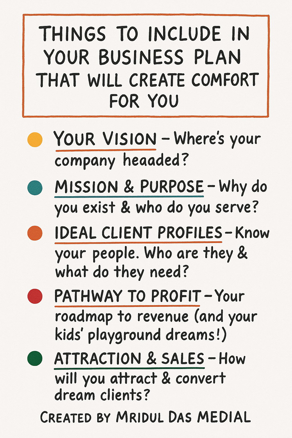 Things to Include in Your Business Plan That Will Create Comfort for You. Here are 5 must-haves you canโt skip: 1. Your Vision โ Whereโs your company headed? 2. Mission & Purpose โ Why do you exist & who do you serve? 3. Ideal Client Profiles โ Kn