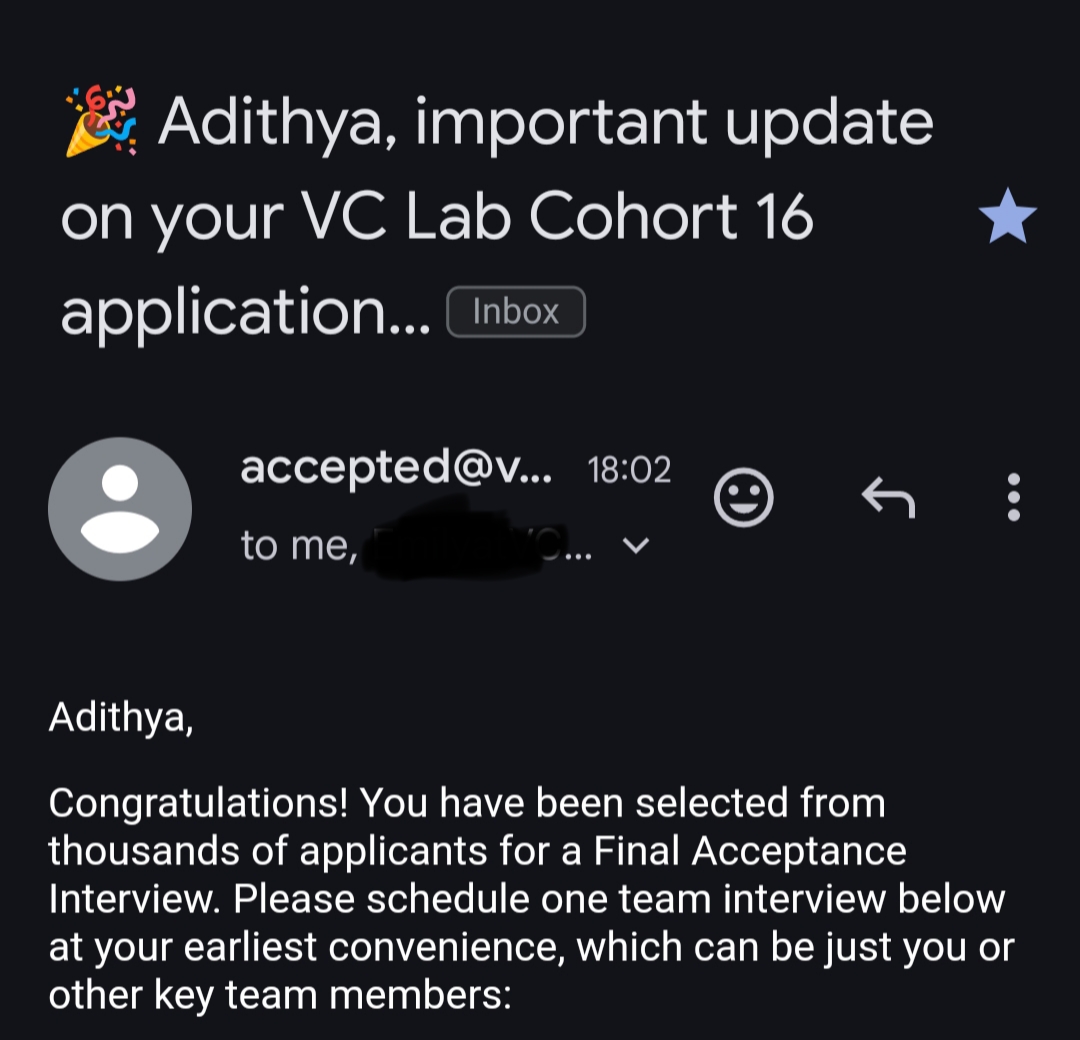 🎯Just One Step away from forming the Venture Capital Fund ✅Yes, Today I got selected for the Interview Round of VC lab Cohort 16 ( Selected for two Cohorts by the way) 🗣️I talked & Interviewed 500+ Indian Founders in the last few years & all