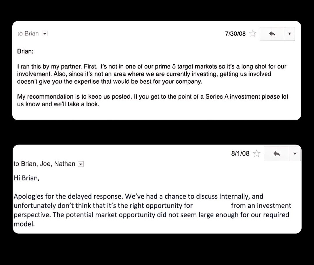 In the early days of Airbnb, founders Brian Chesky, Joe Gebbia, and Nathan Blecharczyk struggled to find investors. They tried to raise $150,000 for 10% of the company but faced many rejections. Despite pitching to several prominent investors, no one