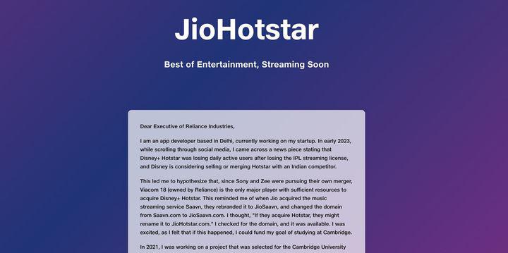 Plot Twist in Jio & Hotstar Merger JioHotstra (.com) is owned by a student, and now he is willing to sell it to Reliance Industries to fund his studies.