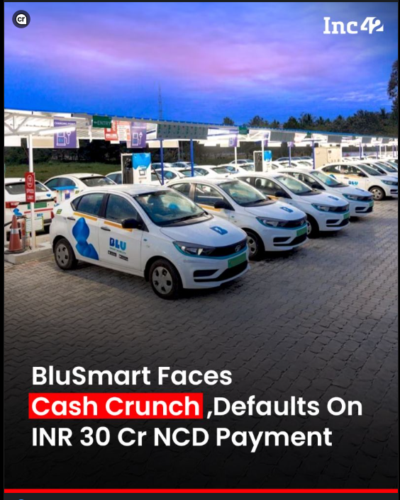 Electric cab-hailing startup BluSmart Mobility is reportedly grappling with a cash crunch, which caused the Delhi NCR-based company to default on INR 30 Cr of debt in early February. 🔰 BluSmart, which is in the middle of raising about INR 434 Cr in