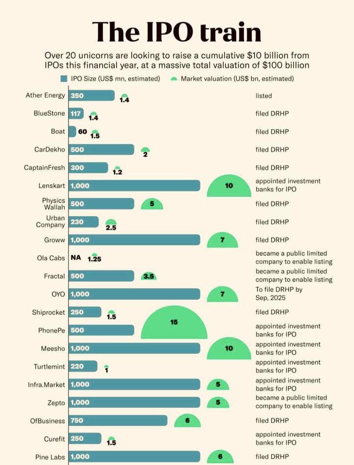 The IPO train is getting crowded. Over 20 Indian unicorns are gearing up to hit the public markets. Together, they plan to raise around $10 Billion,with a combined valuation of $100 Billion+ From Zepto and Lenskart to Physics Wallah and Groww — ev