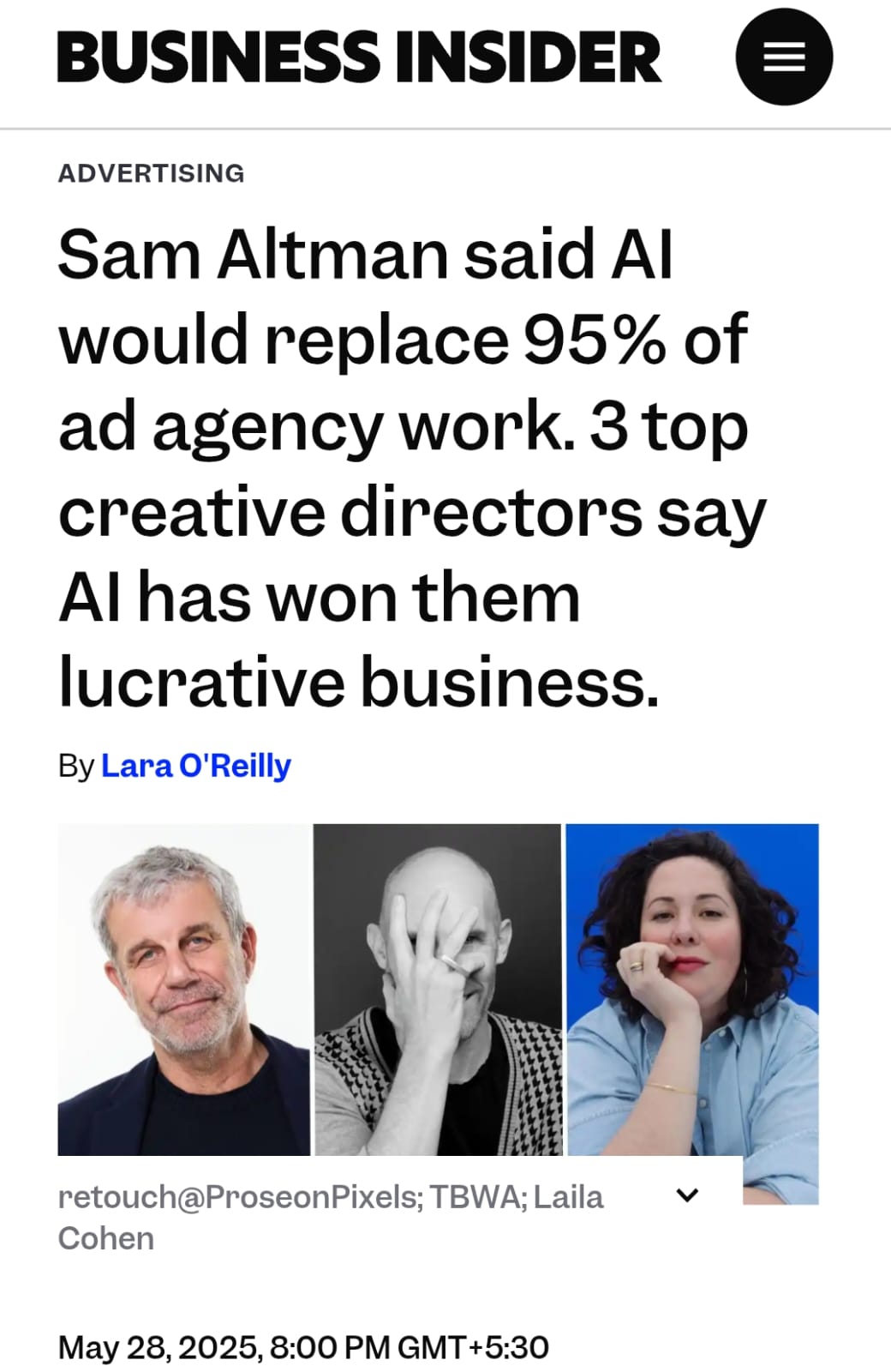 Altman said: AI Would Replace 95% of Ad Work. Not So Fast! Top Creatives Say AI is Their New Superpower for Winning BIG! 🚀🤖 Top creative directors are already using AI not to replace jobs, but to supercharge their pitches and win lucrative new bus