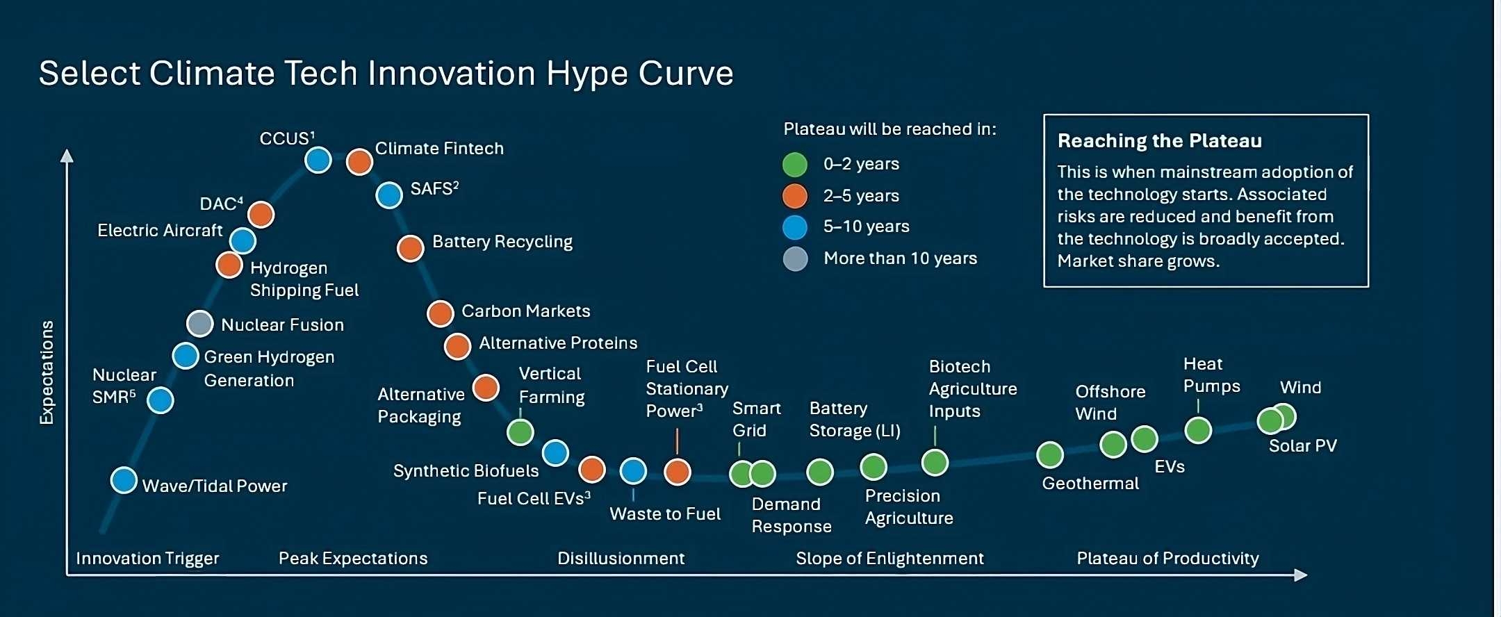 This graphic depicts the innovation stage of various climate technologies. It utilizes a โhype curveโ to illustrate the level of excitement and interest for each. Those on the left side of the curve, such as carbon capture and storage (CCUS), are in