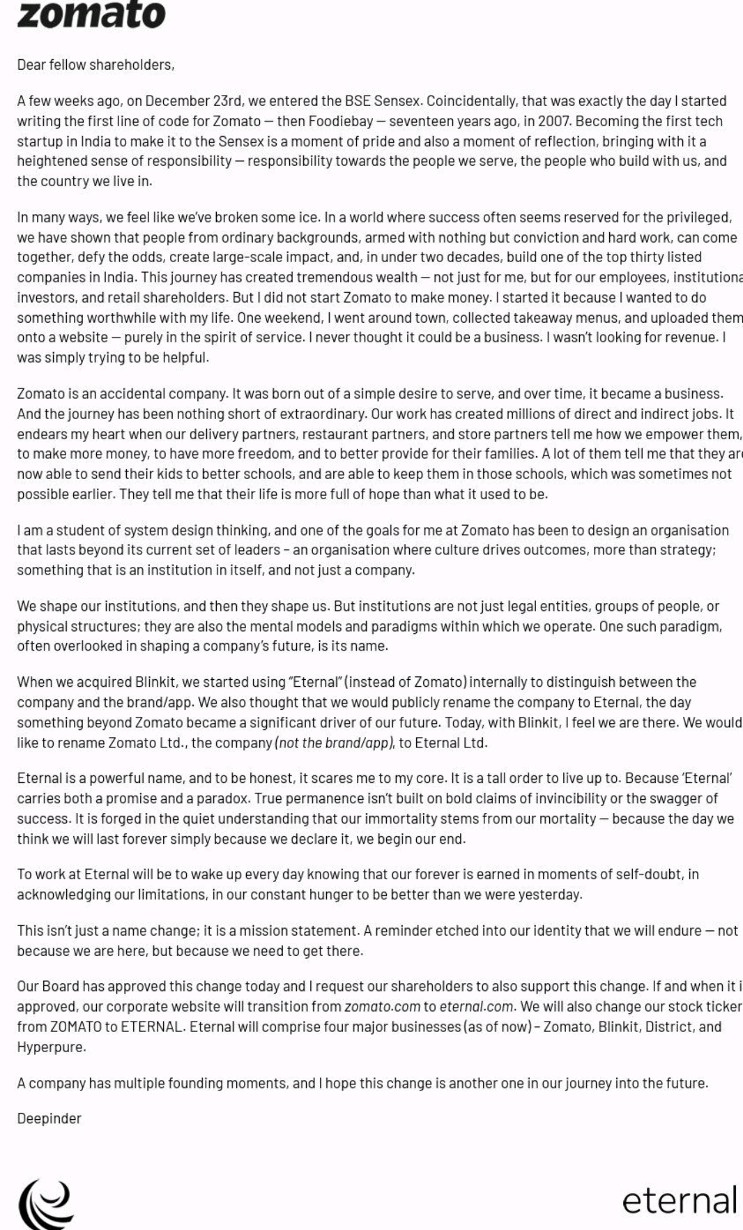Zomato is now Eternal. The company's board has approved the change in its name today.