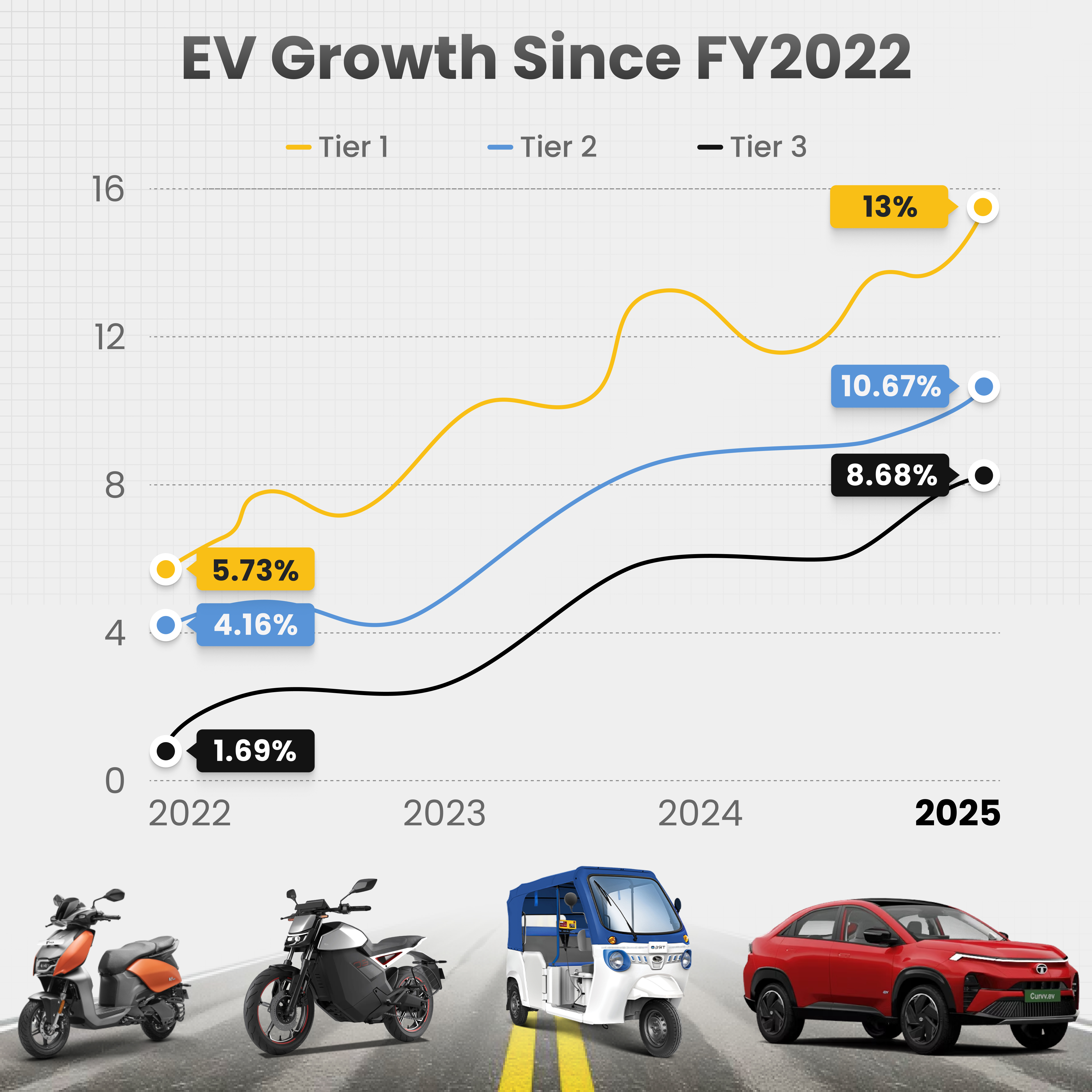 EV Growth Since FY2022: Tier 3 Cities Are Catching Up Fast! Hereโs how electric vehicle adoption has accelerated across India: - Tier 1: 5.73% โก๏ธ 13% - Tier 2: 4.16% โก๏ธ 10.67% - Tier 3: 1.69% โก๏ธ 8.68% From metros to small towns, Indiaโs EV revolut
