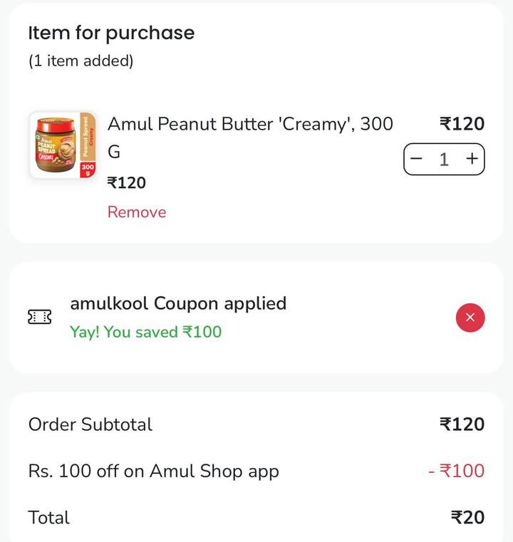 Amul Crunchy Peanut Butter 300g for just โน20! Steps: 1๏ธโฃ Install Amul Shop App 2๏ธโฃ Add to cart 3๏ธโฃ Apply code AMULKOOL for โน100 off 4๏ธโฃ Checkout and enjoy! Tip: โข You can order any product, just apply AMULKOOL. โข Create a new account to reuse the