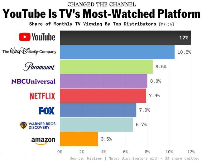 YouTube is the most important media company in the world! 🥇 - 12% of American TV time is spent on YouTube - YouTube Shorts rival giants like TikTok and Reels by hours watched - 125M Premium Subscribers YouTube is a $1T+ company in the making!