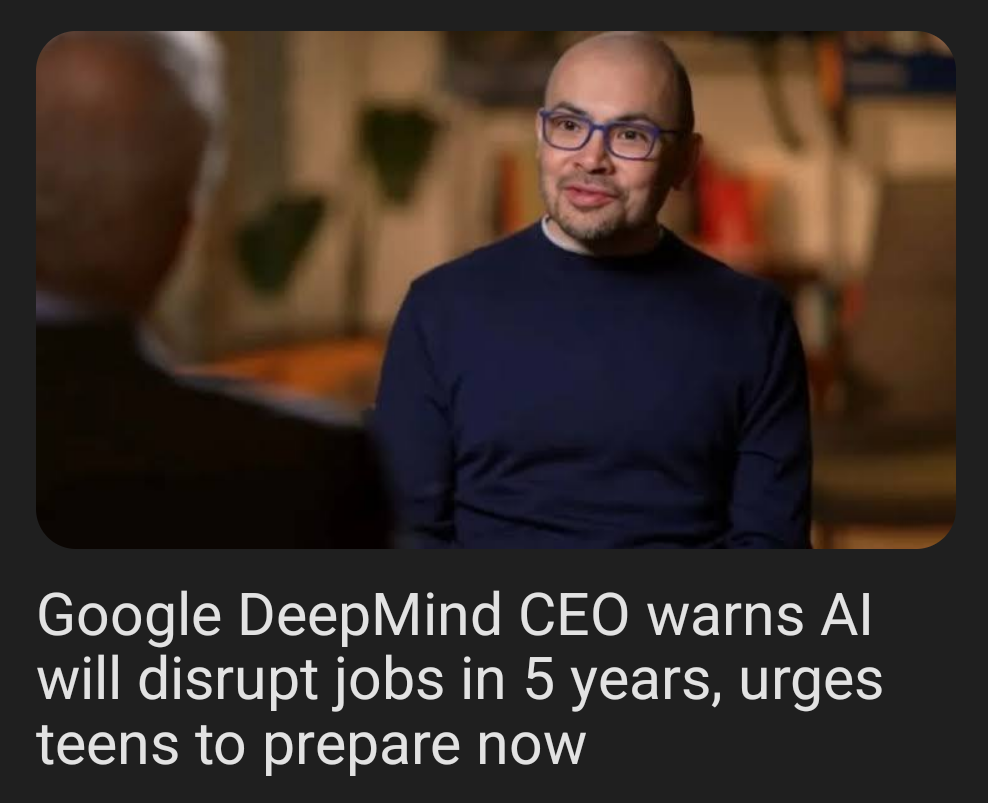 Ai will DISRUPT MORE JOBs in coming 5 to 10 years... Google DeepMind CEO Demis Hassabis warns that AI will reshape the job market within the next 5 to 10 years, just like the internet and smartphones did for previous generations. ~ His advice to teenagers Become AI Ninjas — immerse yourself in AI tools, understand how they work, and start building with them. Hassabis, leading Google’s push towards AGI, says a strong STEM foundation (especially coding) is key. But even more crucial are meta-skills ~ like: Creativity, Adaptability, Resilience Why? Because AI will struggle to replicate these human traits and they’ll help you thrive as industries transform. Embrace cognitive agility over just hard skills. Explore beyond formal education and experiment with fast-changing tools and fields.