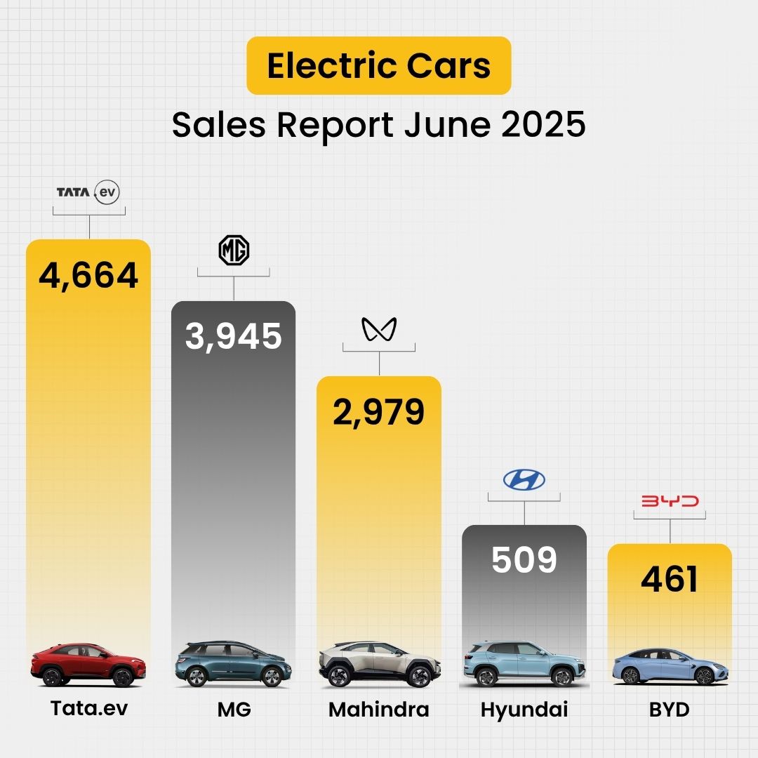 Top Electric Car Sales – June 2025 (India) 1️⃣ Tata.ev 2️⃣ MG 3️⃣ Mahindra 4️⃣ Hyundai 5️⃣ BYD Who do you think will top the charts by year-end?