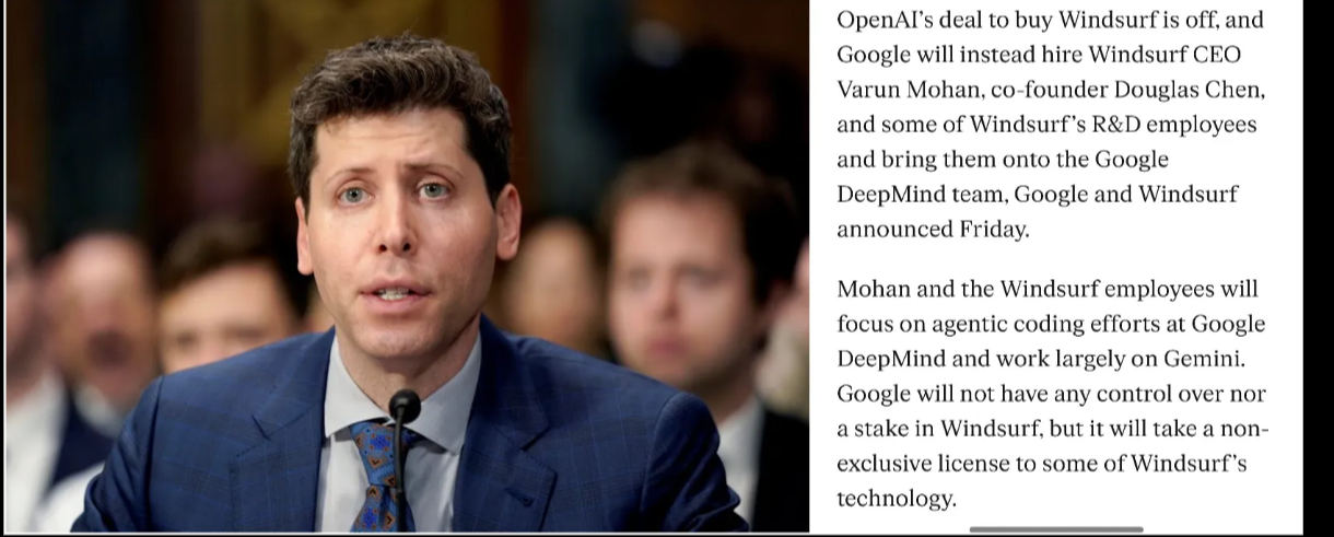 Google snatches Windsurf from OpenAl! Google has struck a $2.4 billion deal to license Al start-up Windsurf's technology and hire its CEO Varun Mohan and co-founder Douglas Chen. The agreement allows Windsurf to remain independent under a non-exclus