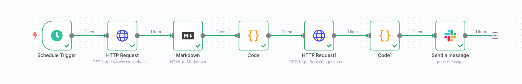 Another day, another automation. Every midnight, this bot checks my Bitcoin wallet and updates my Slack with the exact balance in both BTC and USD. No tabs. No dashboards. Just pure signal. 🧠 Built with: - Blockchain.com scraping - CoinGecko API for real-time price - n8n + Slack API for delivery But this is just the surface. The bot can also: - 💸 Alert on incoming/outgoing transactions - ✅ Confirm when they're finalized - 🧾 Respond to commands like: - "Get Balance" - "Get last 5 transactions" - "Get incoming/outgoing history" 📲 All this from a single Slack channel. This is not just tracking. This is financial awareness on autopilot.
