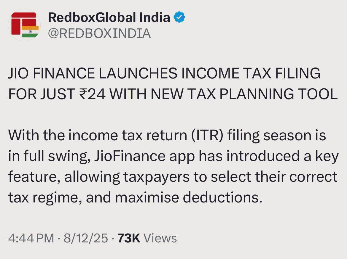 ๐จ Jio Finance Launched ITR Filing Feature โข Self Filing Plan : โน24 โข Assisted Services : โน999 Another Big Disruption From Jio Finance ITR Filing at โน24 is Tempting For Many People โน24 for ITR filing is seriously disruptive! Most CAs charge โน