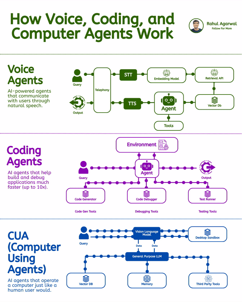 How do Voice, Coding & Computer Agents work? I've explained each one in a very simple way below. 1. ๐ฉ๐ผ๐ถ๐ฐ๐ฒ ๐๐ด๐ฒ๐ป๐๐ AI systems that talk with people using speech. Examples: Vapi, Retell AI, OpenAI TTS etc. ๐ฆ๐๐ฒ๐ฝ๐: 1. ๐จ๐๐ฒ๐ฟ ๐๐ฝ๐ฒ๐ฎ๏ฟฝ