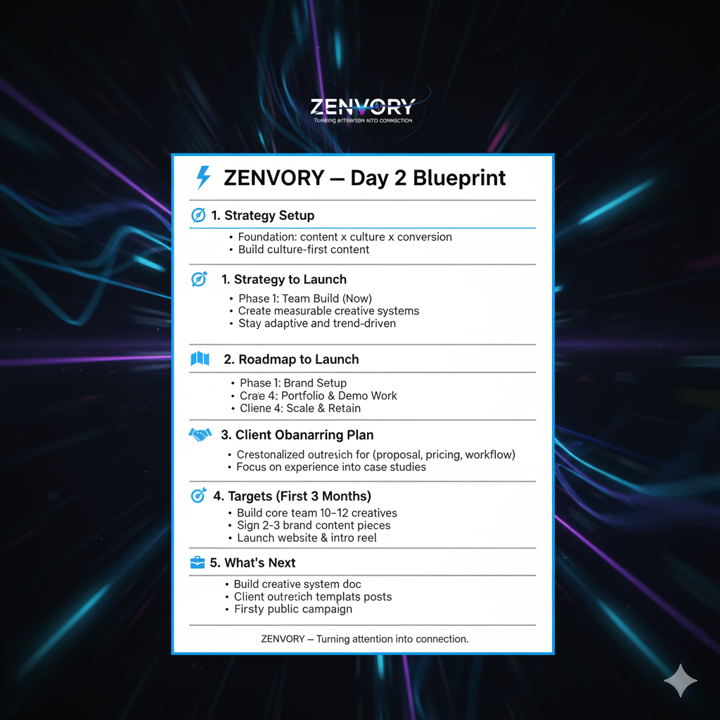 The setup mode is officially on. We’re mapping out how Zenvory will grow — not just fast, but smart. From onboarding systems to creative pipelines, we’re building a roadmap that connects ideas → execution → clients → results. We’re defining: 🎯 How