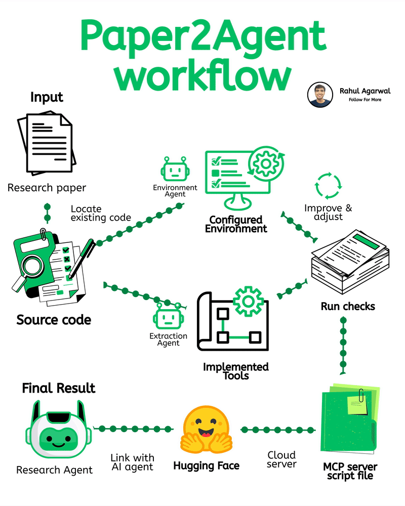 Finally, the 𝗥𝗲𝘀𝗲𝗮𝗿𝗰𝗵 𝗔𝗴𝗲𝗻𝘁 connects everything into a single 𝗔𝗜 𝗔𝗴𝗲𝗻𝘁, a ready-to-use, working system derived directly from a research paper.