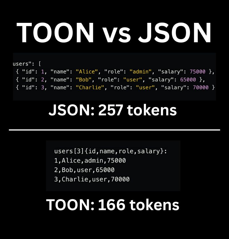 If you know TOON, you’re ahead of 99% of people. JSON is dead. TOON is for modern AI systems. If you’re still sending JSON to your LLMs… you’re wasting money. 𝗧𝗢𝗢𝗡 (𝗧𝗼𝗸𝗲𝗻-𝗢𝗿𝗶𝗲𝗻𝘁𝗲𝗱 𝗢𝗯𝗷𝗲𝗰𝘁 𝗡𝗼𝘁𝗮𝘁𝗶𝗼𝗻) is the new standard built specifically for modern AI systems. JSON is bloated. Repetitive. Filled with quotes, keys, and braces that LLMs don’t need. TOON removes all this noise, making your prompts 𝗹𝗶𝗴𝗵𝘁𝗲𝗿, 𝗳𝗮𝘀𝘁𝗲𝗿, 𝗮𝗻𝗱 𝗳𝗮𝗿 𝗺𝗼𝗿𝗲 𝗟𝗟𝗠-𝗳𝗿𝗶𝗲𝗻𝗱𝗹𝘆. ✅ What TOON delivers • 30–60% 𝗳𝗲𝘄𝗲𝗿 𝘁𝗼𝗸𝗲𝗻𝘀 for uniform arrays • 𝗛𝗶𝗴𝗵𝗲𝗿 𝗮𝗰𝗰𝘂𝗿𝗮𝗰𝘆 due to explicit field sets & lengths • 𝗖𝗹𝗲𝗮𝗻𝗲𝗿 𝘀𝘁𝗿𝘂𝗰𝘁𝘂𝗿𝗲 with minimal syntax • 𝗙𝘂𝗹𝗹 𝗰𝗼𝗺𝗽𝗮𝘁𝗶𝗯𝗶𝗹𝗶𝘁𝘆 with JSON (convert in/out instantly) JSON vs TOON Same data → up to 60% 𝗳𝗲𝘄𝗲𝗿 𝘁𝗼𝗸𝗲𝗻𝘀 → better comprehension. The numbers speak: • 64% 𝘁𝗼𝗸𝗲𝗻 𝘀𝗮𝘃𝗶𝗻𝗴𝘀 for tabular data • ~74% 𝗿𝗲𝘁𝗿𝗶𝗲𝘃𝗮𝗹 𝗮𝗰𝗰𝘂𝗿𝗮𝗰𝘆 (vs ~70% with JSON) • 76% 𝗯𝗲𝘁𝘁𝗲𝗿 𝗰𝗼𝘀𝘁-𝗲𝗳𝗳𝗶𝗰𝗶𝗲𝗻𝗰𝘆 per 1,000 tokens For teams running 𝗮𝗴𝗲𝗻𝘁𝘀, 𝗥𝗔𝗚 𝗽𝗶𝗽𝗲𝗹𝗶𝗻𝗲𝘀, 𝗽𝗿𝗼𝗱𝘂𝗰𝘁 𝗰𝗮𝘁𝗮𝗹𝗼𝗴𝘀, 𝗹𝗼𝗴𝘀, 𝗺𝘂𝗹𝘁𝗶-𝘁𝗼𝗼𝗹 𝘄𝗼𝗿𝗸𝗳𝗹𝗼𝘄𝘀, 𝗼𝗿 𝗹𝗼𝗻𝗴-𝗰𝗼𝗻𝘁𝗲𝘅𝘁 𝗽𝗿𝗼𝗺𝗽𝘁𝘀, the savings compound fast. Don't see TOON as a JSON replacement. TOON isn’t a new API format. It’s becoming the 𝗻𝗲𝘄 𝘀𝘁𝗮𝗻𝗱𝗮𝗿𝗱 𝗳𝗼𝗿 𝗟𝗟𝗠 𝗰𝗼𝘀𝘁-𝗲𝗳𝗳𝗶𝗰𝗶𝗲𝗻𝗰𝘆. Your app still uses JSON. Only your LLM sees TOON. ➡️ JSON → TOON → LLM → back to JSON Fast. Accurate. Built for LLMs. If your company uses modern AI systems, this can save a lot of money, compounding over time. ✅ Repost for others in your network who can benefit from this.