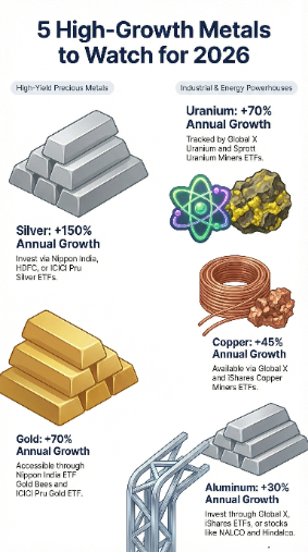 📈 5 High-Growth Metals to Watch for 2026 🔥 If you’re tracking the next big opportunities in commodities, these metals deserve your attention 👀👇 🥈 Silver – 🚀 +150% potential annual growth ⚛️ Uranium – ⚡ +70% growth driven by clean energy demand 🥇 Gold – 🛡️ +70% growth as a safe-haven asset 🔌 Copper – 🔋 +45% growth with EV & infrastructure boom 🏗️ Aluminium – 📊 +30% steady industrial growth 💡 Why metals? Global electrification, renewable energy, infrastructure projects, and inflation hedging are pushing long-term demand higher. 📌 Smart investors diversify, not chase trends. Do your research, invest via ETFs or quality stocks, and think long-term. 👉 Which metal are you most bullish on for 2026? Comment below ⬇️ ⚠️ Disclaimer: For educational purposes only. Not financial advice.