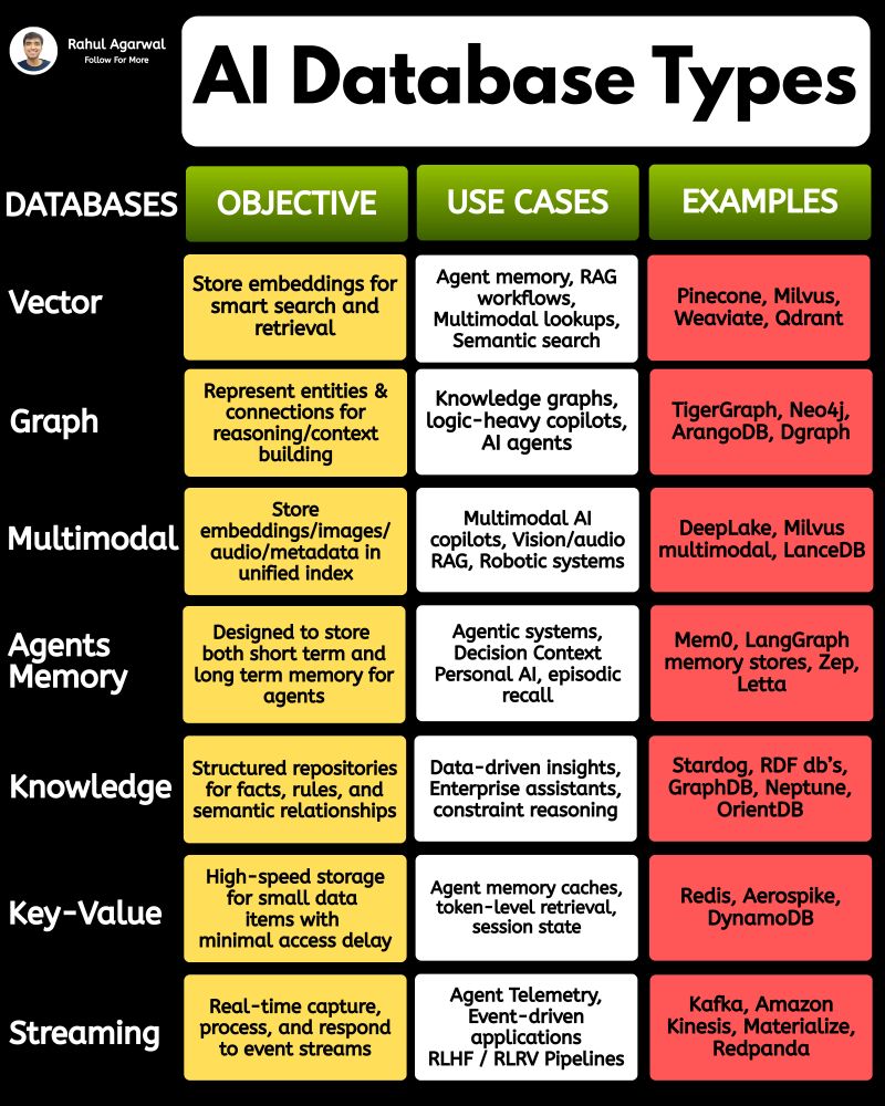 7 database types used in modern AI systems. Iโve explained each one in simple steps. 1. ๐ฉ๐ฒ๐ฐ๐๐ผ๐ฟ ๐๐ฎ๐๐ฎ๐ฏ๐ฎ๐๐ฒ๐ โข ๐ ๐ฎ๐ถ๐ป ๐ฃ๐๐ฟ๐ฝ๐ผ๐๐ฒ: Store embeddings so AI can search by meaning. โข ๐๐ผ๐ ๐ถ๐ ๐๐ผ๐ฟ๐ธ๐: Text/images โ vectors โ nearest match retrieved. โข ๐จ๐๐ฒ๐ฑ ๐ณ๐ผ๐ฟ: RAG, semantic search, agent memory. โข ๐๐ฒ๐๐ ๐ณ๐ผ๐ฟ: Fast, relevant context retrieval. ๐๐ ๐ฎ๐บ๐ฝ๐น๐ฒ: Pinecone, Milvus, Weaviate, Qdrant ____________ 2. ๐๐ฟ๐ฎ๐ฝ๐ต ๐๐ฎ๐๐ฎ๐ฏ๐ฎ๐๐ฒ๐ โข ๐ ๐ฎ๐ถ๐ป ๐ฃ๐๐ฟ๐ฝ๐ผ๐๐ฒ: Store entities and their relationships for reasoning. โข ๐๐ผ๐ ๐ถ๐ ๐๐ผ๐ฟ๐ธ๐: Data stored as nodes (things) and edges (connections). โข ๐จ๐๐ฒ๐ฑ ๐ณ๐ผ๐ฟ: Knowledge graphs, logic-heavy copilots, agents. โข ๐๐ฒ๐๐ ๐ณ๐ผ๐ฟ: Understanding complex relationships. ๐๐ ๐ฎ๐บ๐ฝ๐น๐ฒ: Neo4j, TigerGraph, ArangoDB, Dgraph ____________ 3. ๐ ๐๐น๐๐ถ๐บ๐ผ๐ฑ๐ฎ๐น ๐๐ฎ๐๐ฎ๐ฏ๐ฎ๐๐ฒ๐ โข ๐ ๐ฎ๐ถ๐ป ๐ฃ๐๐ฟ๐ฝ๐ผ๐๐ฒ: Store text, images, audio together. โข ๐๐ผ๐ ๐ถ๐ ๐๐ผ๐ฟ๐ธ๐: Multiple data types stored in one index. โข ๐จ๐๐ฒ๐ฑ ๐ณ๐ผ๐ฟ: Multimodal copilots, vision/audio RAG. โข ๐๐ฒ๐๐ ๐ณ๐ผ๐ฟ: AI that sees, hears, and reads. ๐๐ ๐ฎ๐บ๐ฝ๐น๐ฒ: DeepLake, Milvus Multimodal, LanceDB ____________ 4. ๐๐ด๐ฒ๐ป๐ ๐ ๐ฒ๐บ๐ผ๐ฟ๐ ๐๐ฎ๐๐ฎ๐ฏ๐ฎ๐๐ฒ๐ โข ๐ ๐ฎ๐ถ๐ป ๐ฃ๐๐ฟ๐ฝ๐ผ๐๐ฒ: Give AI agents short- and long-term memory. โข ๐๐ผ๐ ๐ถ๐ ๐๐ผ๐ฟ๐ธ๐: Stores past conversations and decisions. โข ๐จ๐๐ฒ๐ฑ ๐ณ๐ผ๐ฟ: Agentic systems, personal AI. โข ๐๐ฒ๐๐ ๐ณ๐ผ๐ฟ: Autonomous, long-running agents. ๐๐ ๐ฎ๐บ๐ฝ๐น๐ฒ: Mem0, LangGraph Memory, Zep, Letta ____________ 5. ๐๐ป๐ผ๐๐น๐ฒ๐ฑ๐ด๐ฒ ๐๐ฎ๐๐ฎ๐ฏ๐ฎ๐๐ฒ๐ โข ๐ ๐ฎ๐ถ๐ป ๐ฃ๐๐ฟ๐ฝ๐ผ๐๐ฒ: Store structured facts and rules. โข ๐๐ผ๐ ๐ถ๐ ๐๐ผ๐ฟ๐ธ๐: Uses schemas and semantic relations. โข ๐จ๐๐ฒ๐ฑ ๐ณ๐ผ๐ฟ: Enterprise assistants, compliance. โข ๐๐ฒ๐๐ ๐ณ๐ผ๐ฟ: Fact-correct AI systems. ๐๐ ๐ฎ๐บ๐ฝ๐น๐ฒ: Stardog, GraphDB, Neptune, OrientDB ____________ 6. ๐๐ฒ๐-๐ฉ๐ฎ๐น๐๐ฒ ๐๐ฎ๐๐ฎ๐ฏ๐ฎ๐๐ฒ๐ โข ๐ ๐ฎ๐ถ๐ป ๐ฃ๐๐ฟ๐ฝ๐ผ๐๐ฒ: Ultra-fast storage for small data. โข ๐๐ผ๐ ๐ถ๐ ๐๐ผ๐ฟ๐ธ๐: Simple key โ value lookup. โข ๐จ๐๐ฒ๐ฑ ๐ณ๐ผ๐ฟ: Caching, session state, agent memory. โข ๐๐ฒ๐๐ ๐ณ๐ผ๐ฟ: Speed-critical operations. ๐๐ ๐ฎ๐บ๐ฝ๐น๐ฒ: Redis, Aerospike, DynamoDB ____________ 7. ๐ฆ๐๐ฟ๐ฒ๐ฎ๐บ๐ถ๐ป๐ด ๐๐ฎ๐๐ฎ๐ฏ๐ฎ๐๐ฒ๐ โข ๐ ๐ฎ๐ถ๐ป ๐ฃ๐๐ฟ๐ฝ๐ผ๐๐ฒ: Process data in real time. โข ๐๐ผ๐ ๐ถ๐ ๐๐ผ๐ฟ๐ธ๐: Handles continuous event streams. โข ๐จ๐๐ฒ๐ฑ ๐ณ๐ผ๐ฟ: Agent telemetry, event-driven AI. โข ๐๐ฒ๐๐ ๐ณ๐ผ๐ฟ: Live, real-time systems. ๐๐ ๐ฎ๐บ๐ฝ๐น๐ฒ: Kafka, Amazon Kinesis, Redpanda โ ๐๐ป ๐๐ต๐ผ๐ฟ๐ โข ๐ฉ๐ฒ๐ฐ๐๐ผ๐ฟ ๐๐ โ Find relevant info โข ๐๐ฟ๐ฎ๐ฝ๐ต ๐๐ โ Understand relationships โข ๐ ๐๐น๐๐ถ๐บ๐ผ๐ฑ๐ฎ๐น ๐๐ โ Handle text + image + audio โข ๐๐ด๐ฒ๐ป๐ ๐ ๐ฒ๐บ๐ผ๐ฟ๐ ๐๐ โ Remember experiences/past actions โข ๐๐ป๐ผ๐๐น๐ฒ๐ฑ๐ด๐ฒ ๐๐ โ Store facts & rules โข ๐๐ฒ๐-๐ฉ๐ฎ๐น๐๐ฒ ๐๐ โ Ultra-fast access โข ๐ฆ๐๐ฟ๐ฒ๐ฎ๐บ๐ถ๐ป๐ด ๐๐ โ React for real time events Every type of database matters because AI needs memory, reasoning, speed, structure, and real-time awareness. โ Repost for others who can benefit from this.