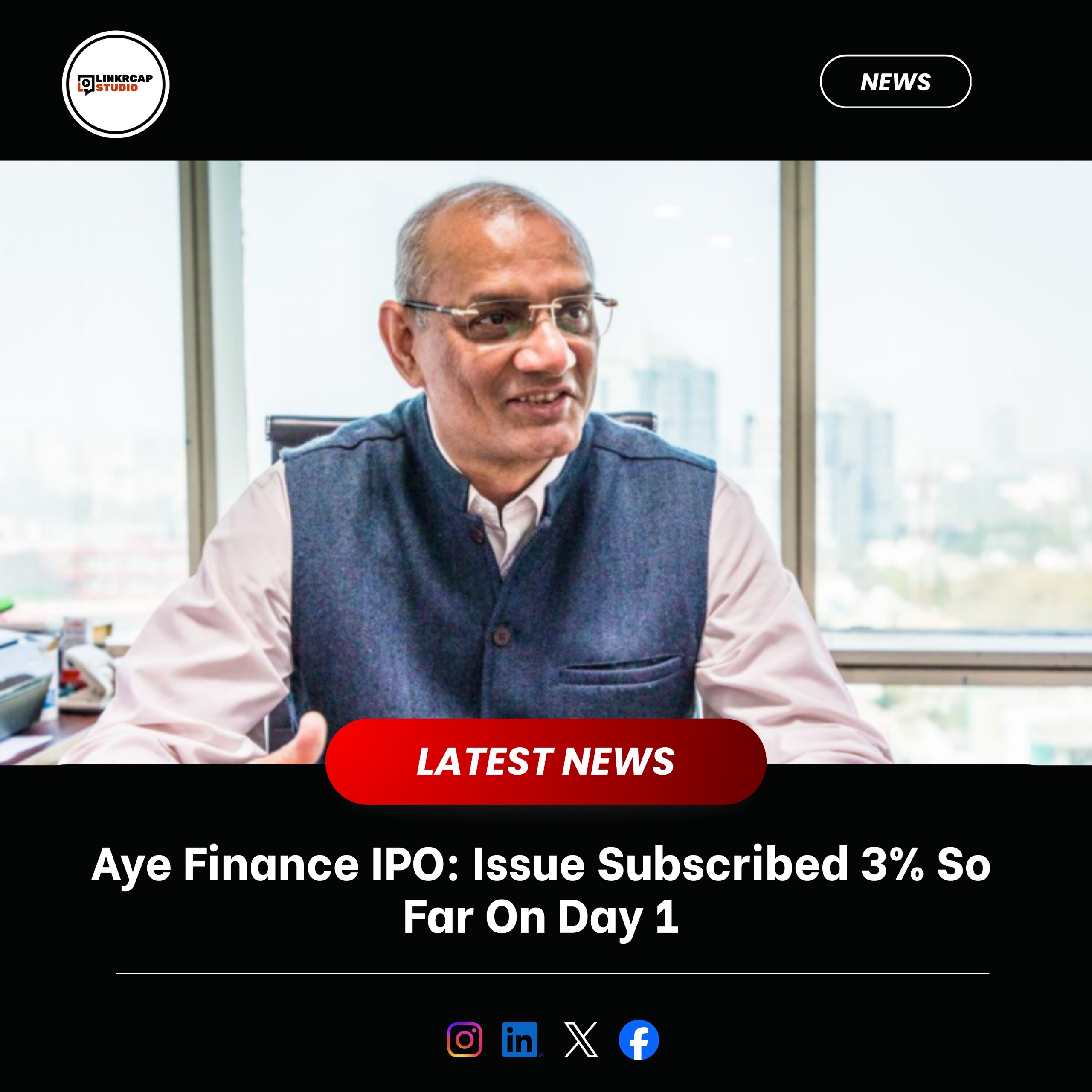 Aye Finance’s initial public offering (IPO) got off to a slow start on the first day of bidding, with the issue subscribed 3% as of 13:09 IST. The IPO failed to attract any interest from qualified institutional buyers (QIBs), with the segment getting zero bids against 2.48 Cr shares reserved for the category. Meanwhile, retail investors’ placed bids for 14.98 Lakh shares against 82.78 Lakh shares on offer, translating to 18% subscription #AYE #Funding #Founders #Entrepreneurship #LinkrcapStudio