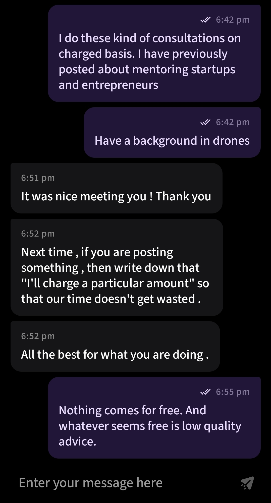 Bro thinks every idea he has is worth billions of dollars and I should just guide them for free. I had posted about a iCreate Drone Challenge and if anybody was participating in it. Nowhere that challenge mentioned food delivery and I did not say I w