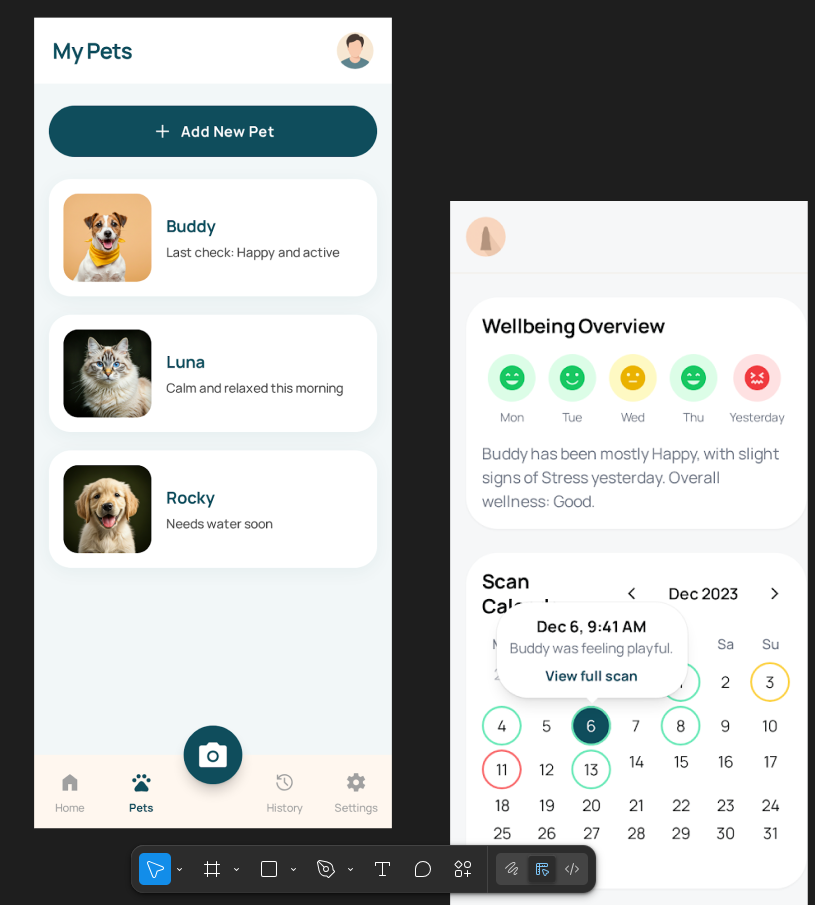 Day 4 of risking everything to build something bigger than myself. I worked on the pets page today and also started shaping part of the history page. It’s all still UI on Figma, nothing implemented yet, but it’s starting to look like an actual produ