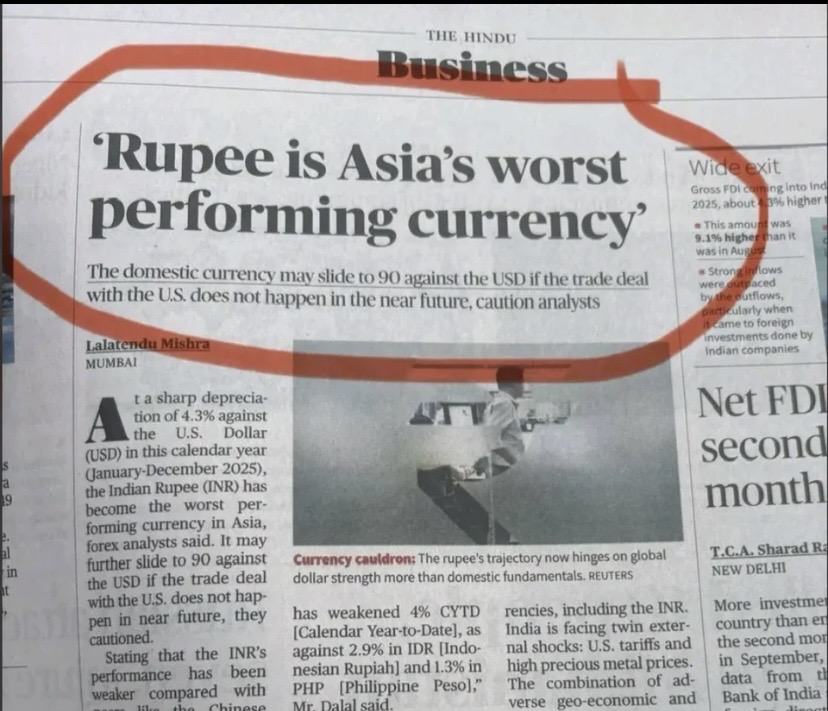 ๐Rupee is Asia's worst performing currency' Asiaโs worstโperforming currencyโ is not a headline any country wants but that is where the rupee finds itself in 2025. With a 4.3% depreciation versus the dollar, record trade deficits fuelled by US tar