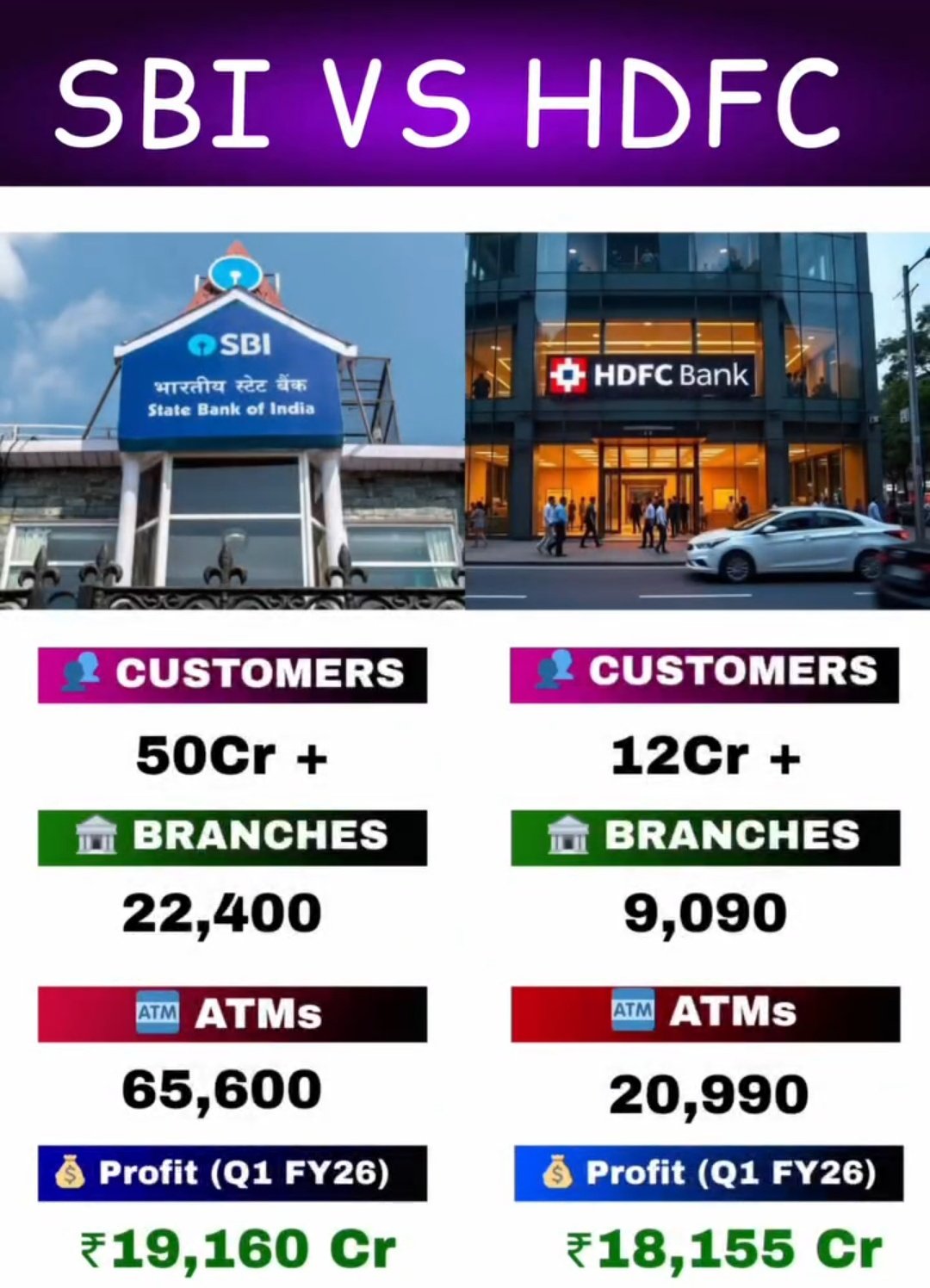 SBI vs HDFC Bank – The Battle of India’s Banking Giants! 🇮🇳 SBI: 50 Cr+ customers | 22,400 branches | ₹19,160 Cr profit 🏦 HDFC Bank: 12 Cr+ customers | 9,090 branches | ₹18,155 Cr profit 👉 Who’s the real king of Indian banking? Comment your o