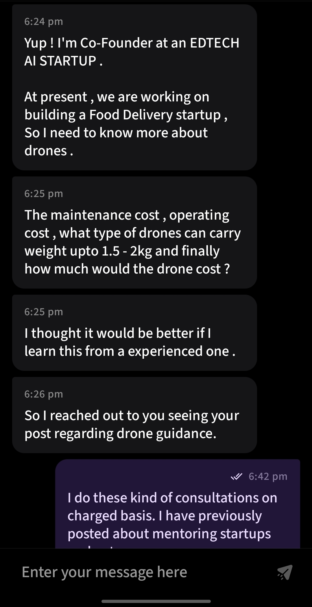 Bro thinks every idea he has is worth billions of dollars and I should just guide them for free. I had posted about a iCreate Drone Challenge and if anybody was participating in it. Nowhere that challenge mentioned food delivery and I did not say I w