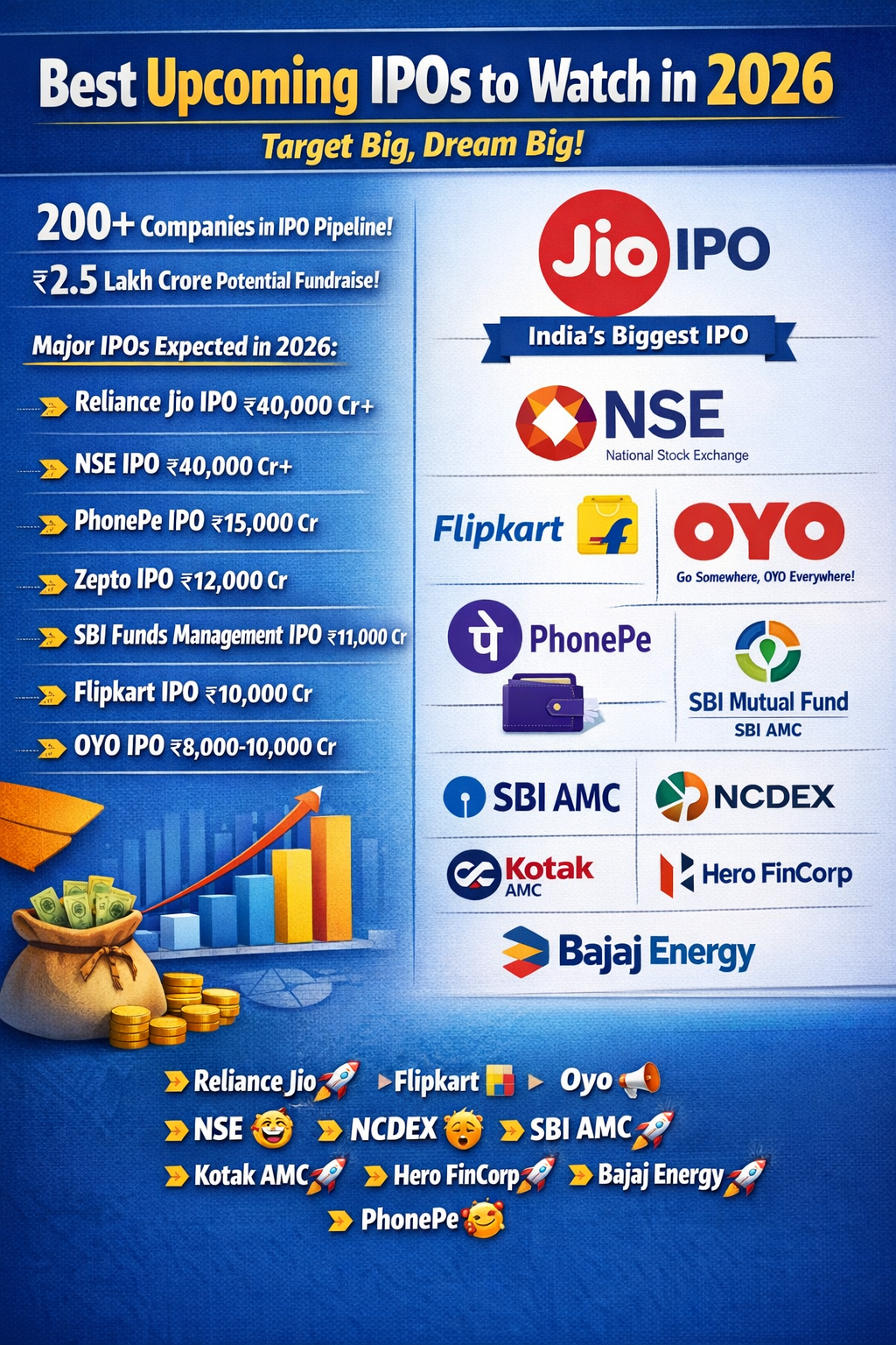 About 200 Companies are either Approved or in the Pipeline for the IPO✨ ✅ About ₹2.5 Lakh Crore Potential Fundraise! ✅ Here are some Awaited Big Sized IPOs for 2026: 👉 Reliance Jio IPO - Expected by to be India's Biggest Ever IPO (₹40,000 Cr+)