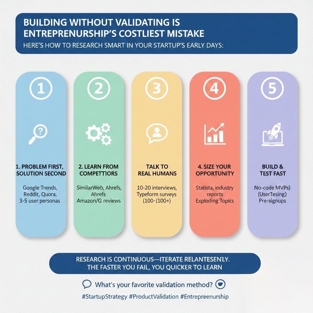 Building without validating is entrepreneurship's costliest mistake. 1. Problem First, Solution Second Identify real pain points using Google Trends, Reddit, and Quora. Define your audience with precision—create 3-5 user personas based on actual mar