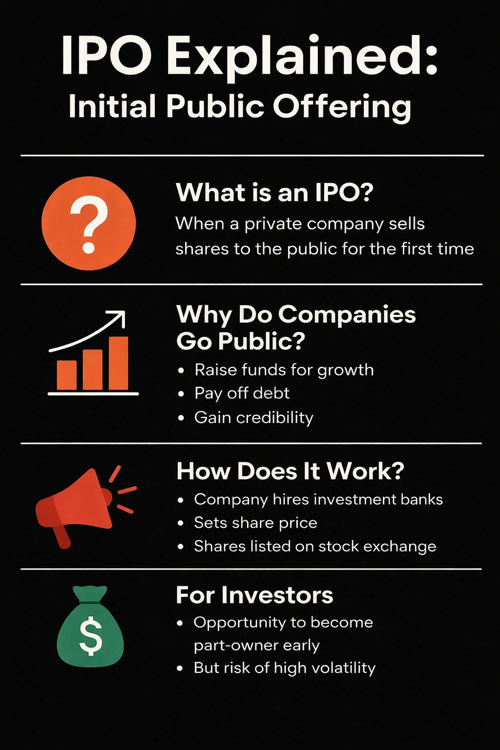 IPO Explained in Simple Words! Ever wondered how companies like startups become publicly traded giants? Here’s a quick breakdown 👇 📌 What is an IPO? When a private company offers its shares to the public for the first time. 📈 Why do companies go p