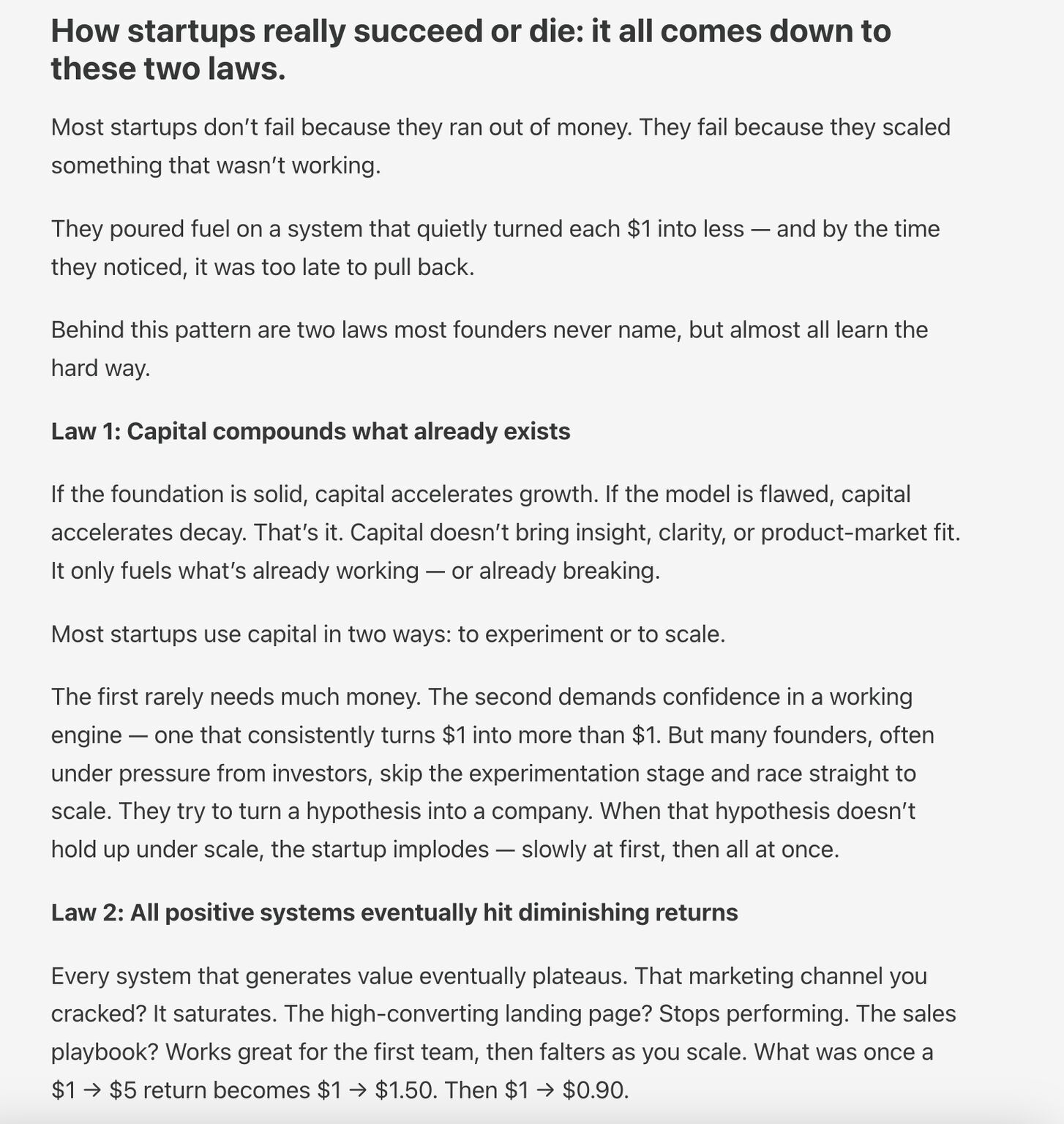 💡 Why most startups really die, and how to avoid it. It’s not because they run out of money. It’s because they scale something that’s fundamentally broken. They raise a round, skip the learning, and pour fuel on a flawed engine..only to realize (t