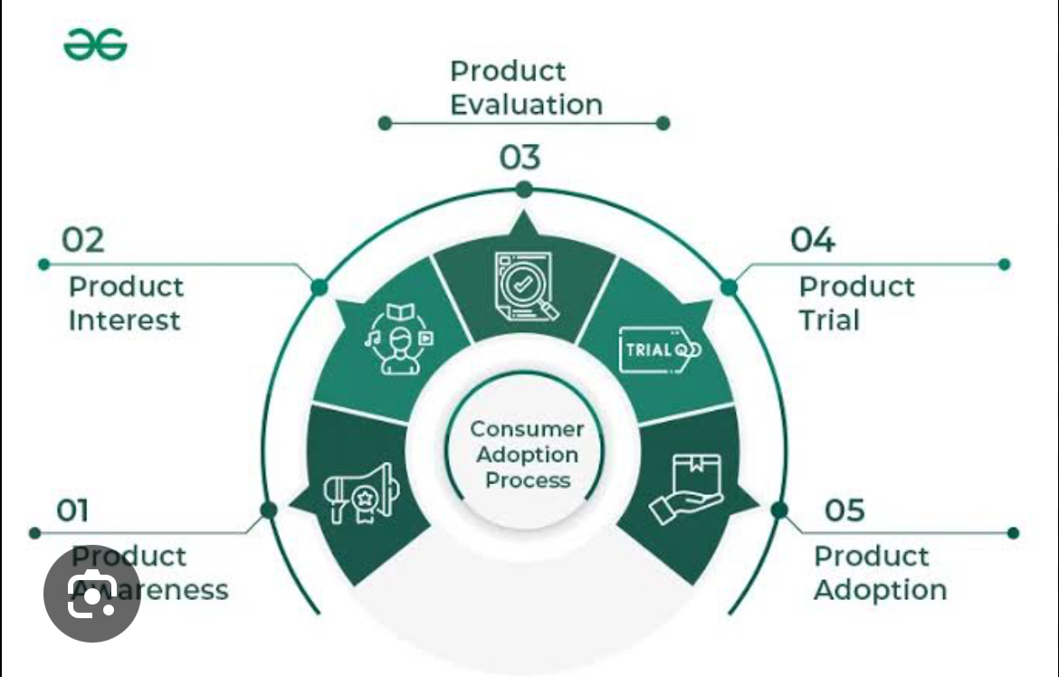 The Consumer Adoption Process The consumer adoption process involves five key stages: Awareness, Interest, Evaluation, Trial, and Adoption. 1. Awareness: Consumers first learn about the product. Example: Tesla created awareness for its EVs through