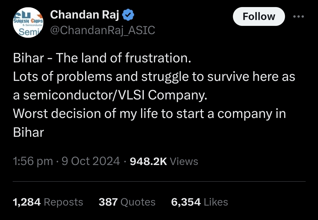 This is what Bihar's own people think about Bihar ... This man started a Semiconductor company in bihar and is now regretting but just imagine if he had started it in States like Gujarat, UP , MH or cities like Chennnai, Banglore or Hyderabad he wou