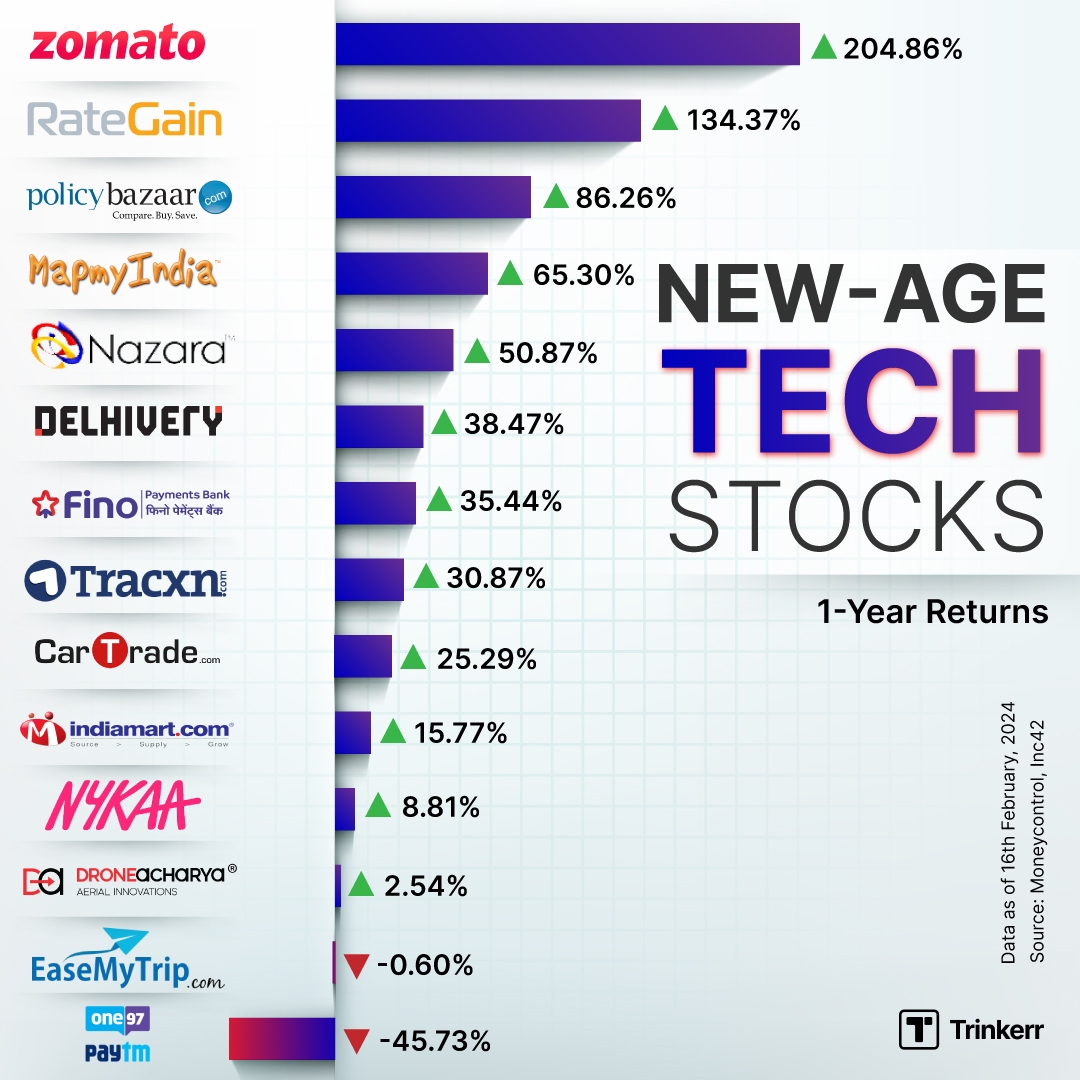 💥 Last year was exceptionally fruitful for new-age tech stocks 📶 These stocks outperformed the market, with Zomato emerging as a frontrunner in this rally, delivering remarkable returns of over 200% within a year 📈 🔥