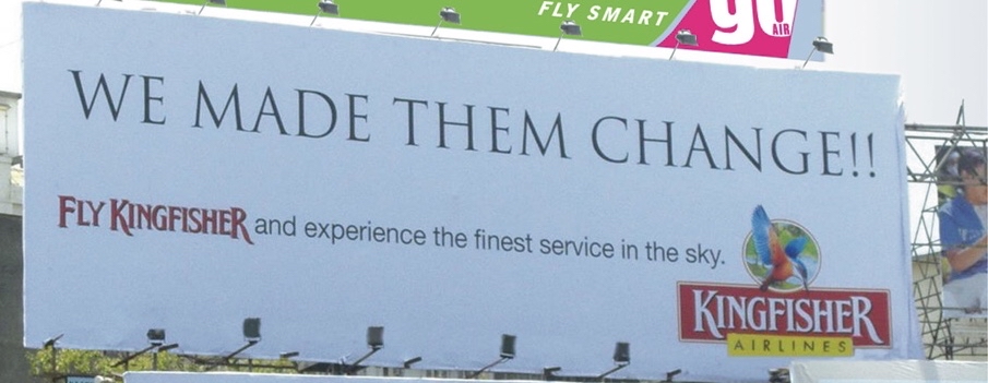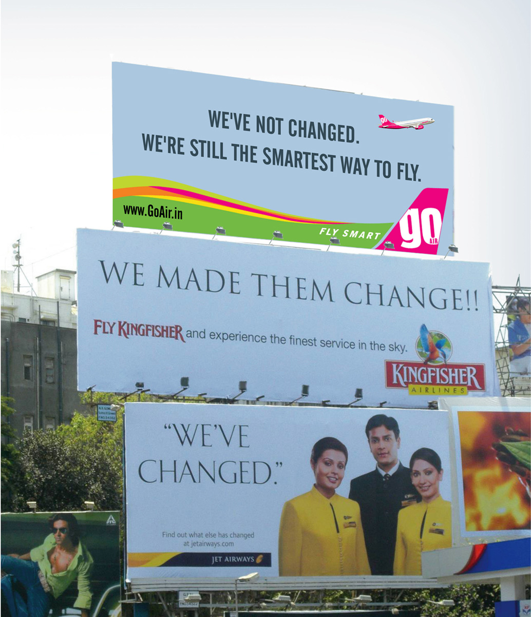 “India's Airline Marketing War” Marketing Face off #4 Jet Airways vs Kingfisher vs GoAir In 2007 after Jet Airways got a makeover from a crisis it put up a Billboard saying "We have changed" Their Rival Kingfisher Airlines put up a Billboard ab