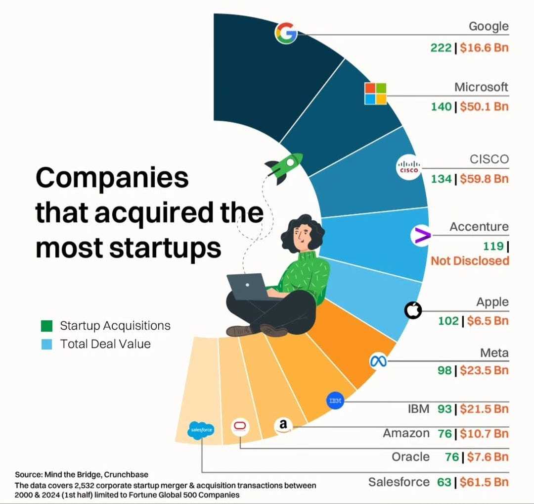 These are the companies that acquired the most startups between 2000 and 2024 I've a question though - How do these companies integrate so many startups into their operations given that they may have varied company culture? And how do these acquisi
