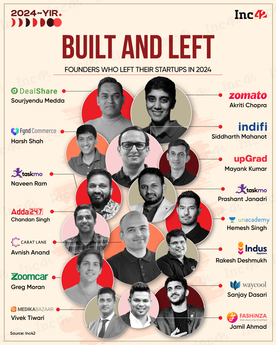 💥 Built & Left: Founders Who Moved On in 2024! 💥 Some of the brightest minds behind India’s top startups stepped aside this year: 🌐 DealShare - Sourjyendu Medda 🍴 Zomato - Akriti Chopra 🛍️ Fynd Commerce - Harsh Shah ⚡ Taskmo - Naveen Ram &