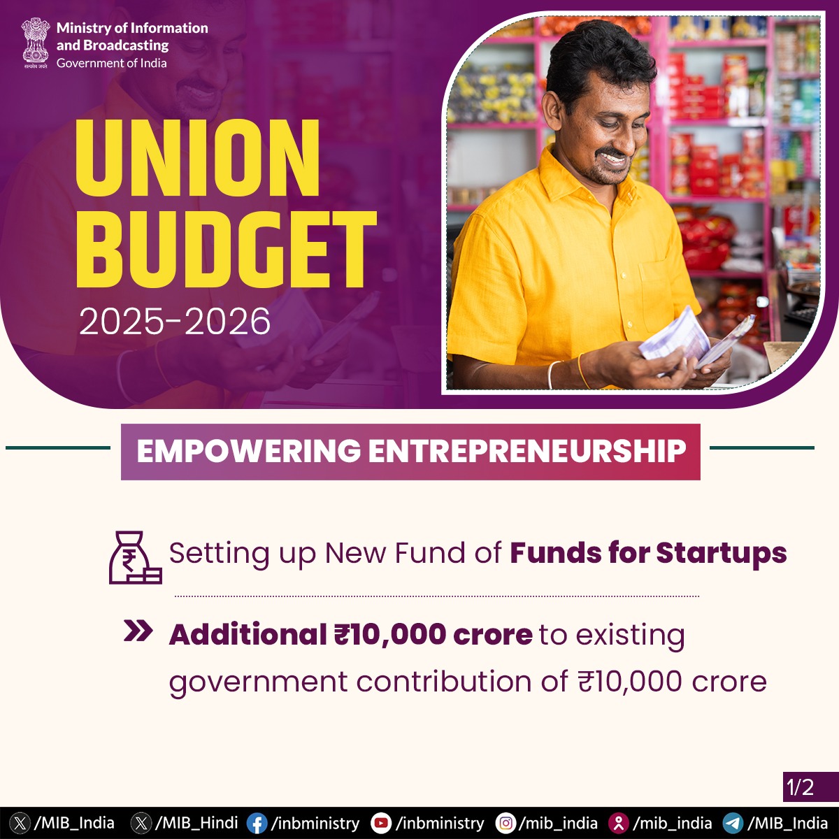 Setting up New Funds with an additional ₹10,000 crore, in addition to existing government contributions of ₹10,000 crore. For 5 lakh first-time entrepreneurs, including women, Scheduled Castes and Scheduled Tribes to be launched #UnionBudget2025