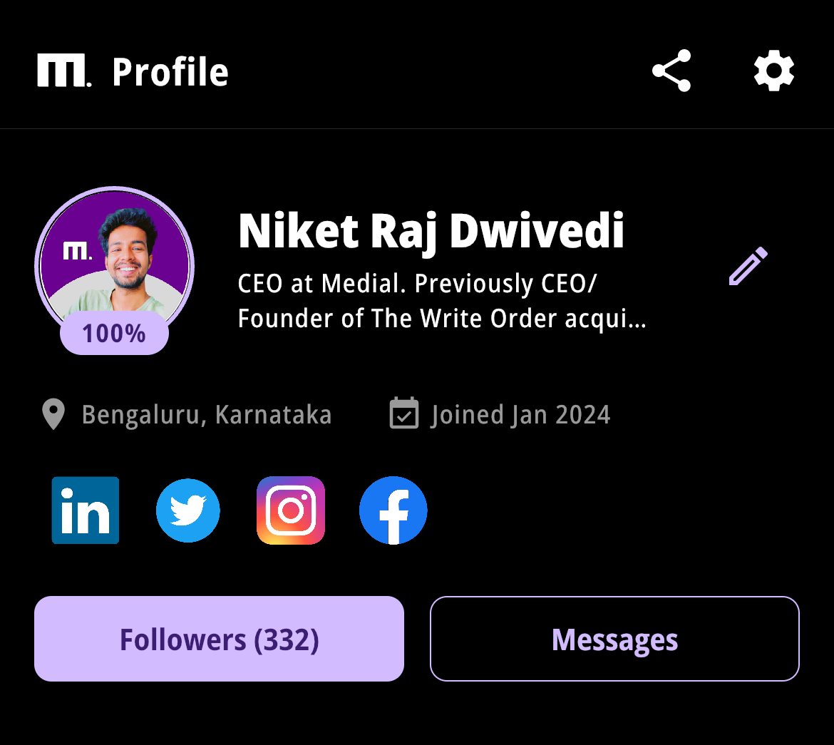 I crossed 100 followers on Medial today! Thanks for showering you love on Medial. I’m proud of how our community is shaping up and would like to thank each one of you ❤️🚀 The first person to reach 100 followers (who isn’t a Medial team member) will