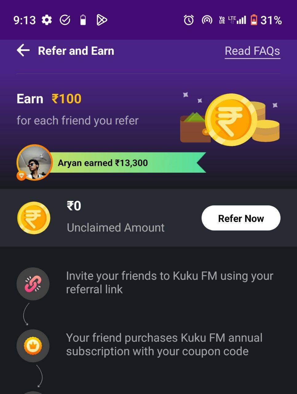 Back in 2022, I used to earn via KuKu FM's refer-and-earn option. I managed to earn around ₹13,300 in a week's time. However, YouTube Shorts later prohibited the use of links in the description box and comments, which significantly impacted my earnin