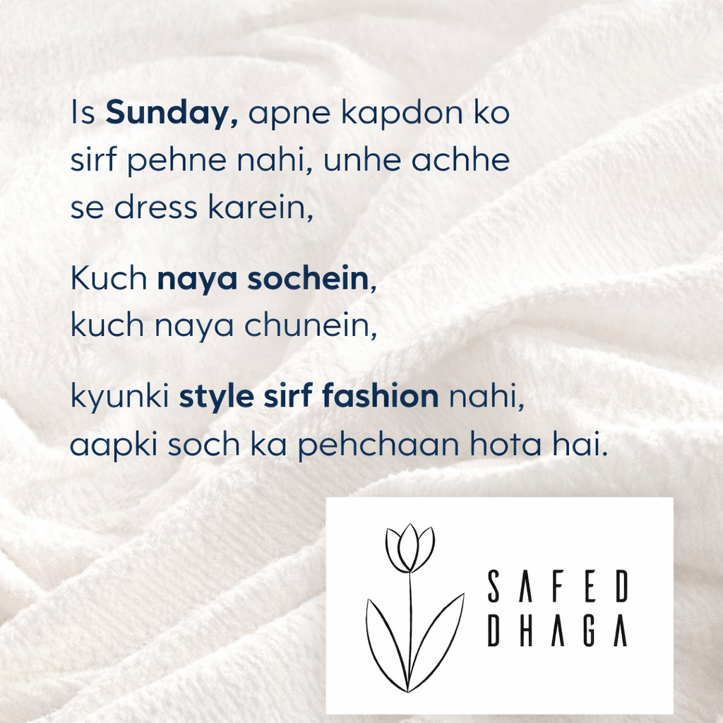 Is Sunday, apne kapdon ko sirf pehne nahi, unhe achhe se dress karein. Kuch naya sochein, kuch naya chunein, kyunki style sirf fashion nahi, aapki soch ka pehchaan hota hai #safeddhaga #baatqualitykiihain #IndianFashion #MinimalFashion #SimpleStyle