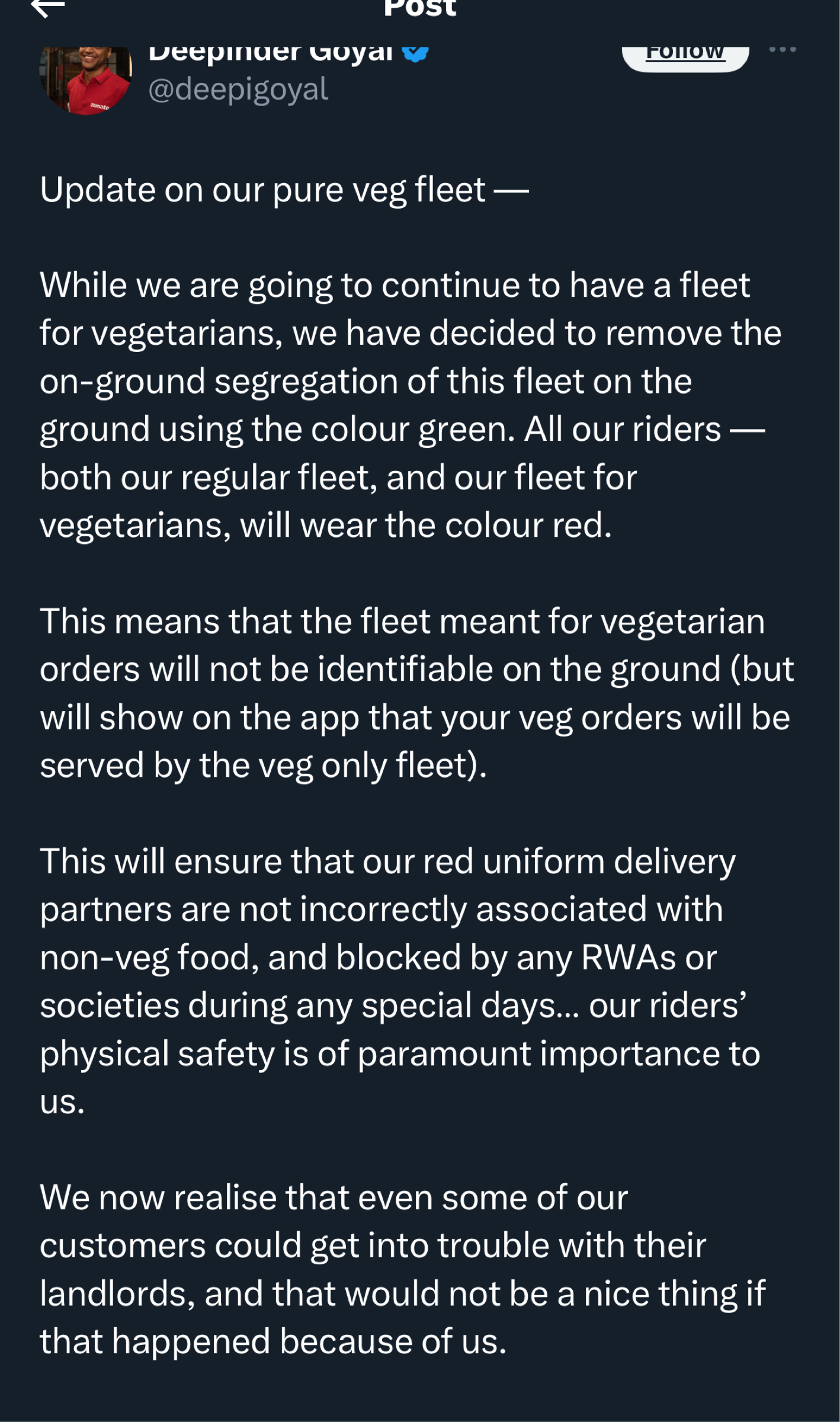 Good or bad? Too many thoughts in my mind. Ideally sounds great for veg people but one day one driver will deliver non veg in green fleet to save time and get caught and Zomato will be doomed defending the backlash. Also a lot of red Tshirt guys migh