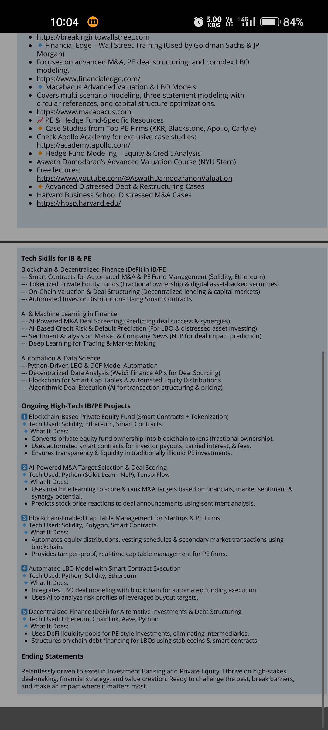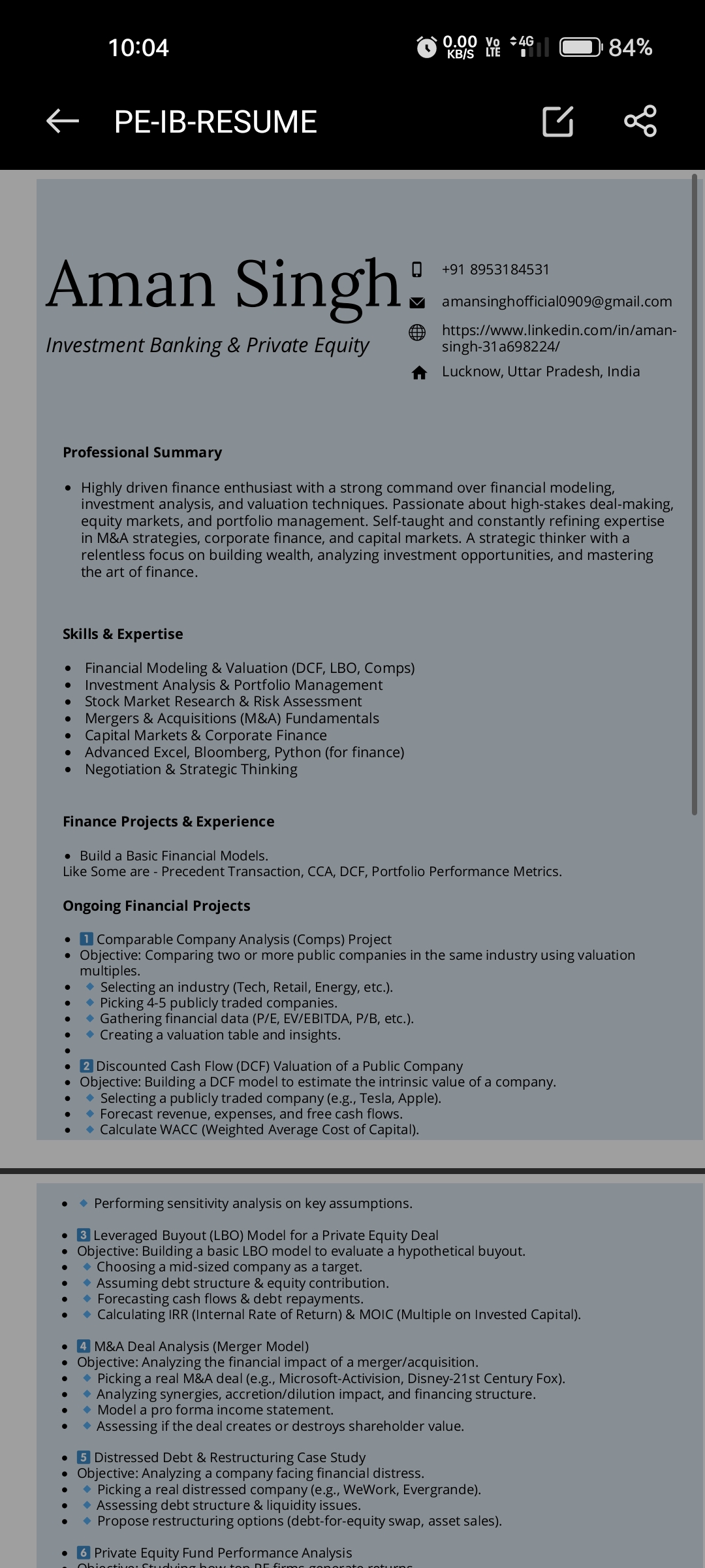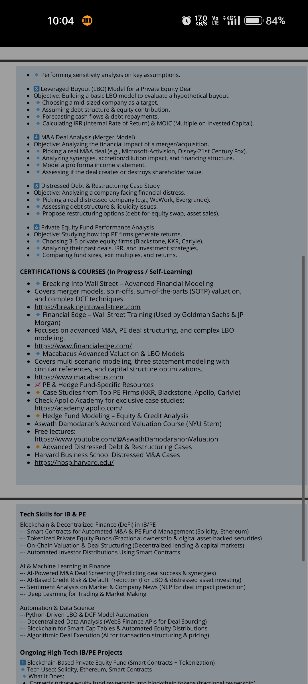 Hii am preparing for IB &PE. I have immense knowledge in this sector. I have build so many models like CCA, DCF, Precedent Transactions etc... I'm finding a person with whom I can learn together and break in this Field. also side by side looking