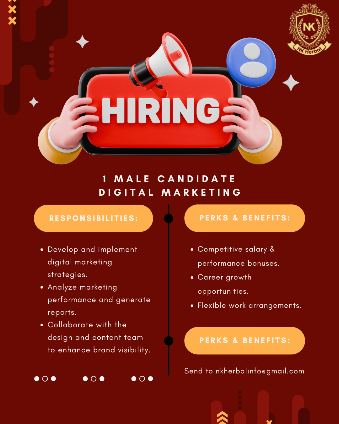 Weāre hiring a Digital Marketing Specialist to lead NK Herbalās online growth. Youāll plan and execute campaigns, manage social media, run email & PPC ads, and optimize SEO. Work closely with our design/content team to create engaging visuals and pos