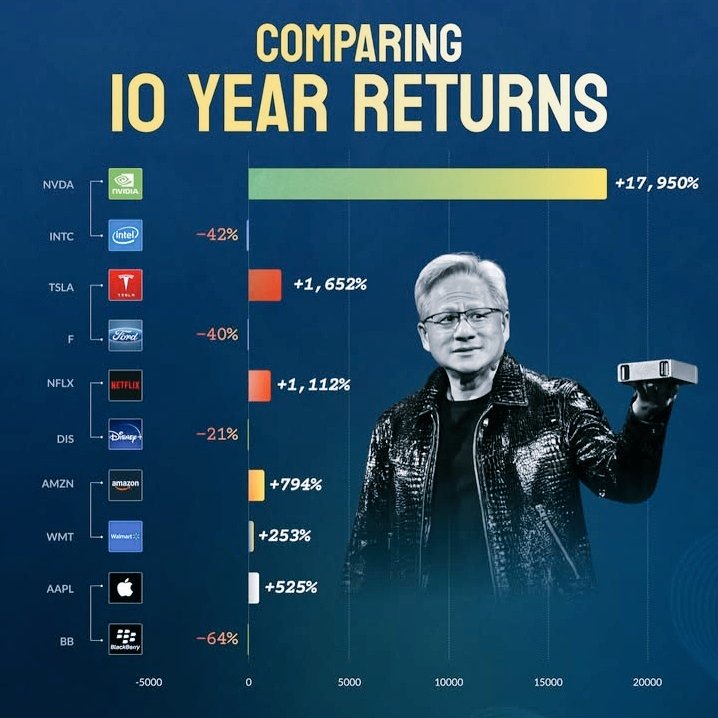 ๐ 10-Year Stock Returns: A Decade of Change Over the past 10 years, companies like NVIDIA have delivered massive returns (+17,950%), while others like BlackBerry have seen major declines (-64%). This comparison shows how innovation, strategy, and m